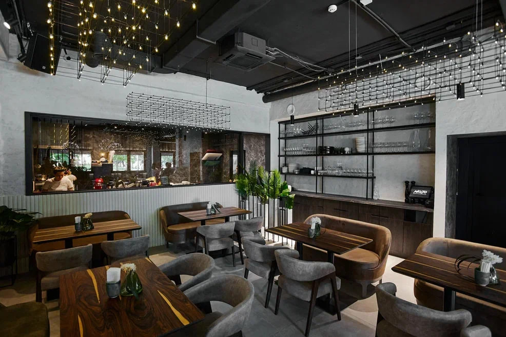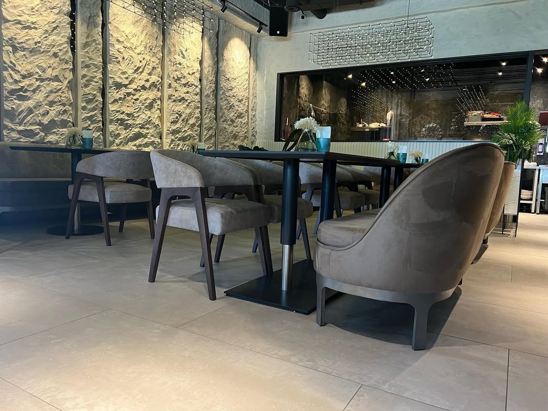 В основании каркаса дивана использован брус и фанера с резинотканой лентой. Материал ножек - металл. Модель дивана FLAFF представлена на нашем сайте в интерьере ресторана "MOJO".