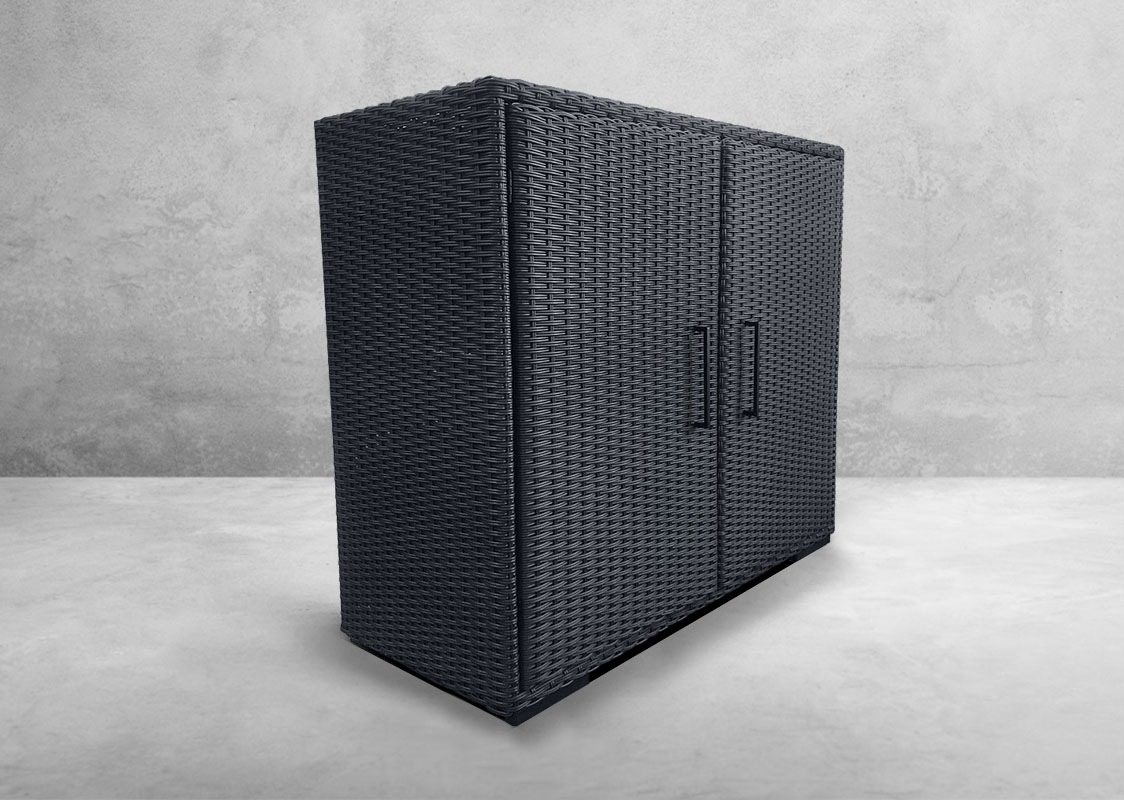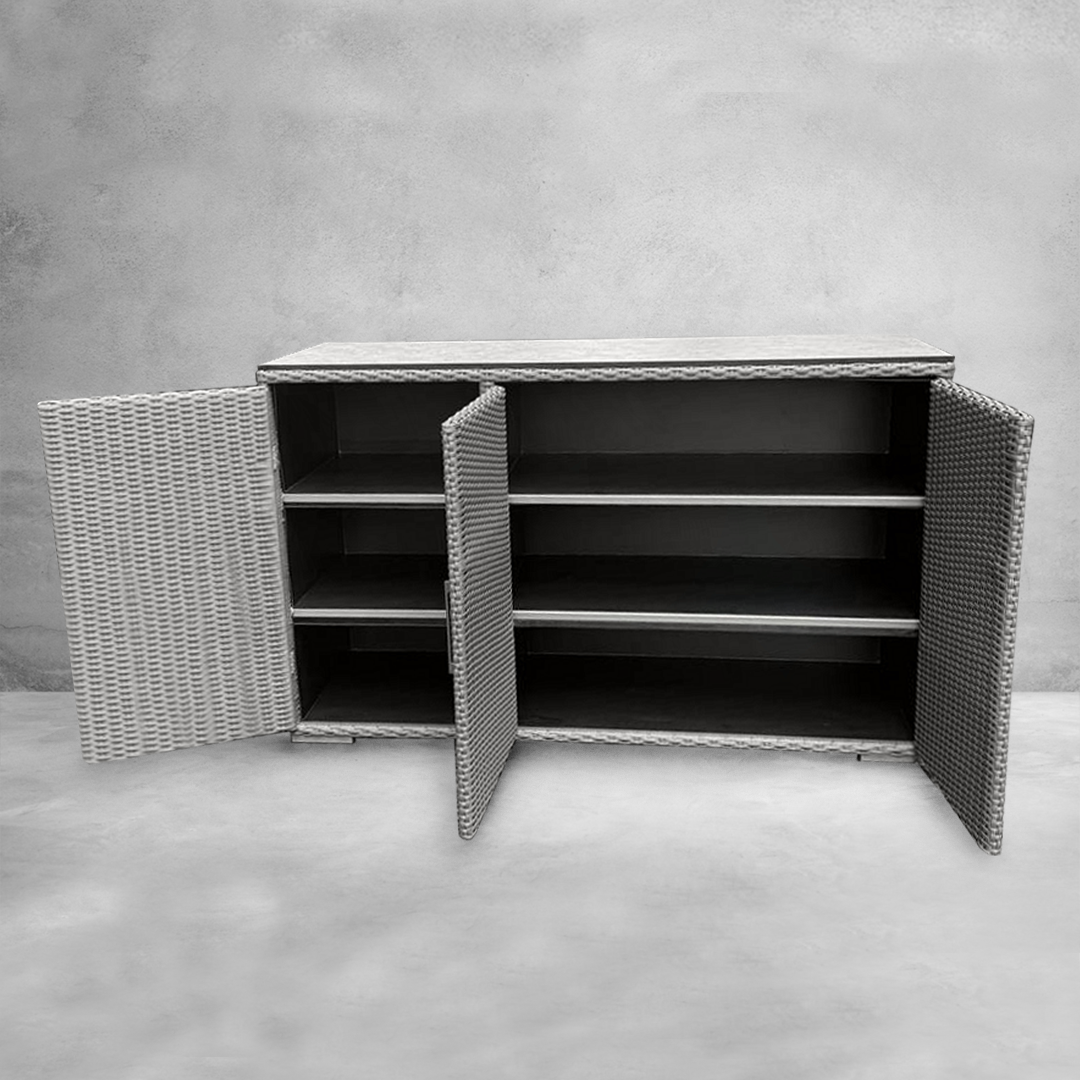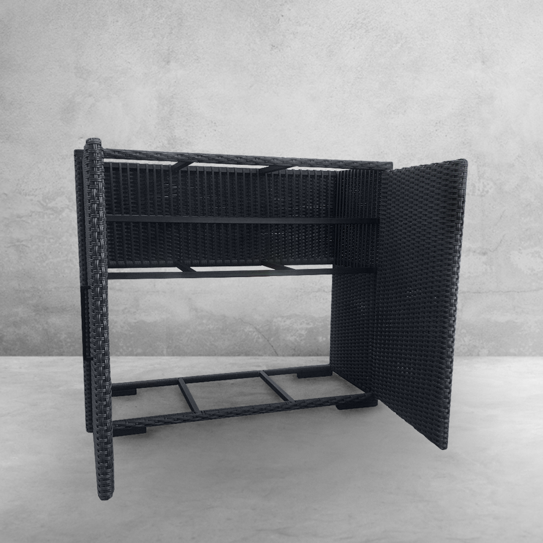 Комод  CHEST на металлическом каркасе, плетеный из искусственного ротанга.  Изготовлен из профильной трубы 20х20 мм, толщина стенки 1,2 - 1,5 мм. Полки шкафа могут быть изготовлены их каленого стекла, ДСП, HPL или металла.  Изготавливается под заказ.