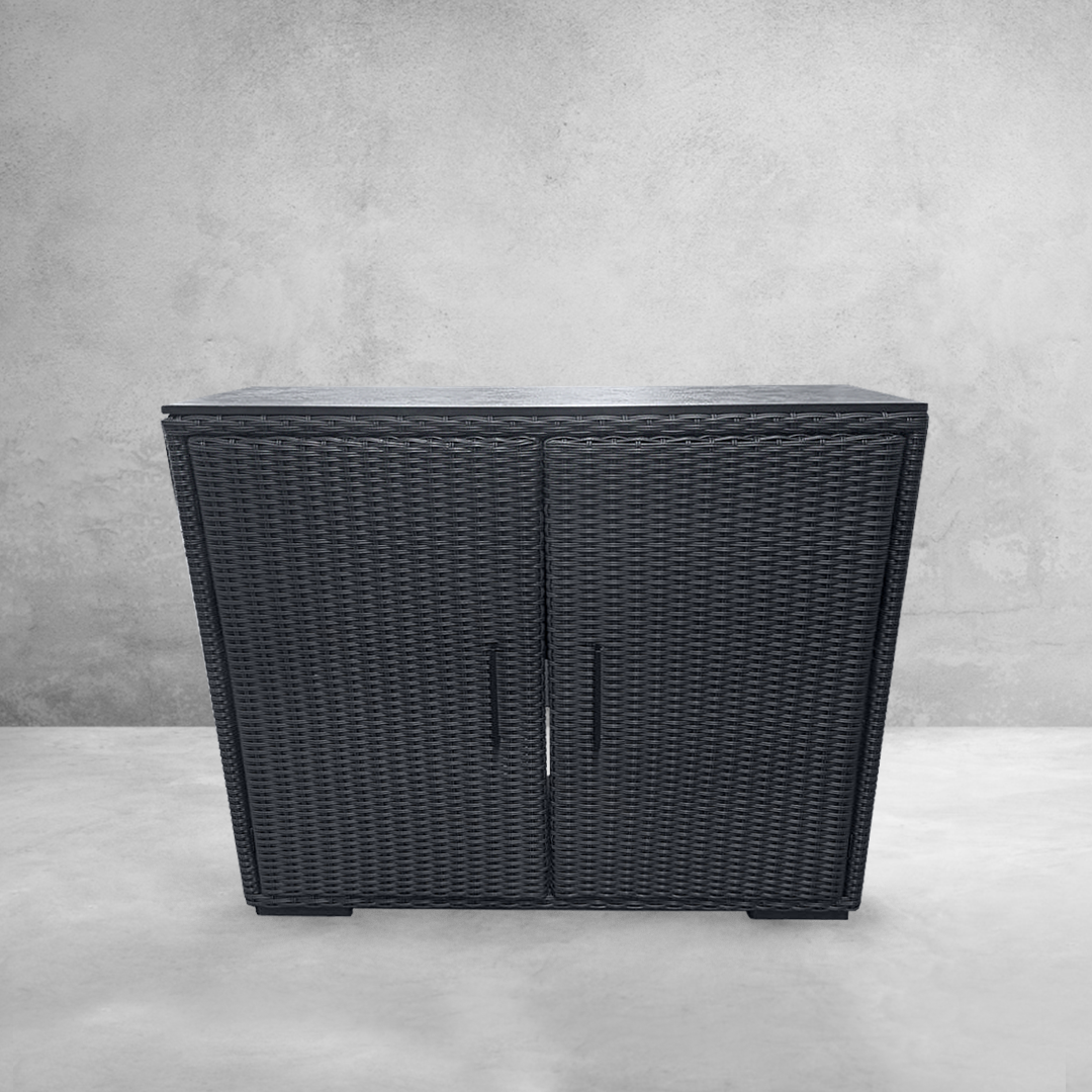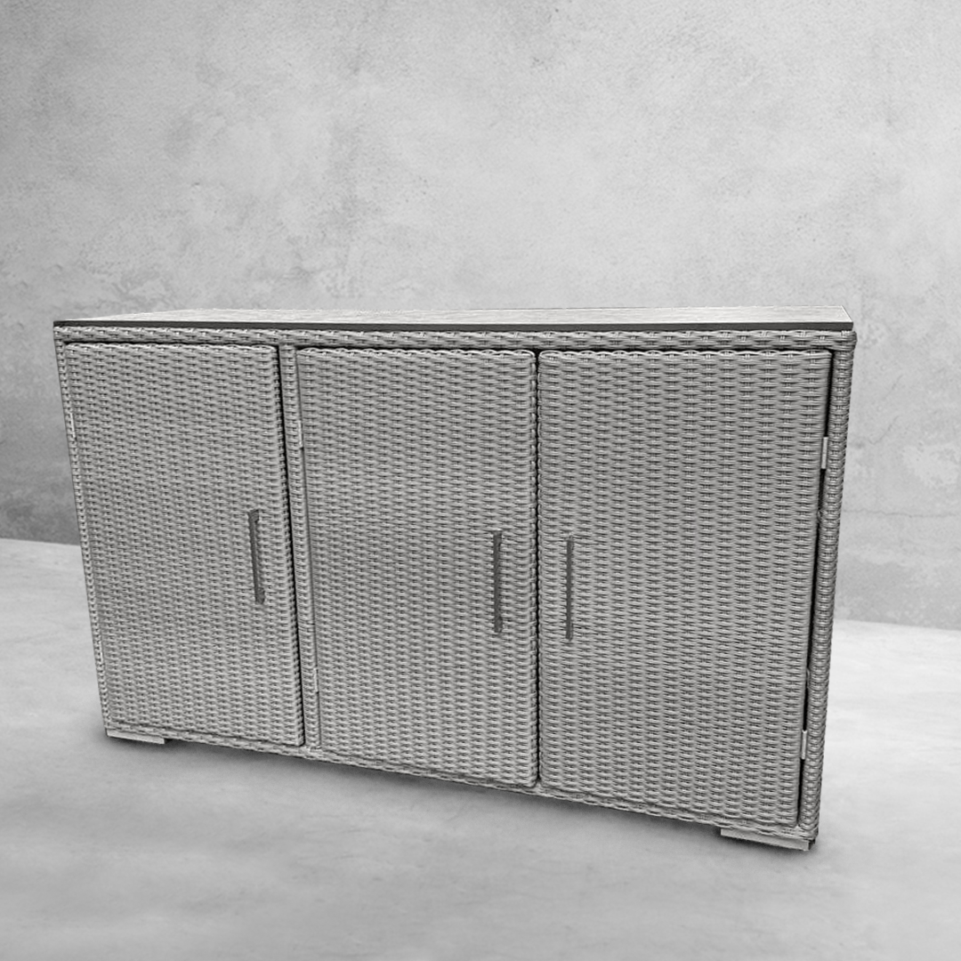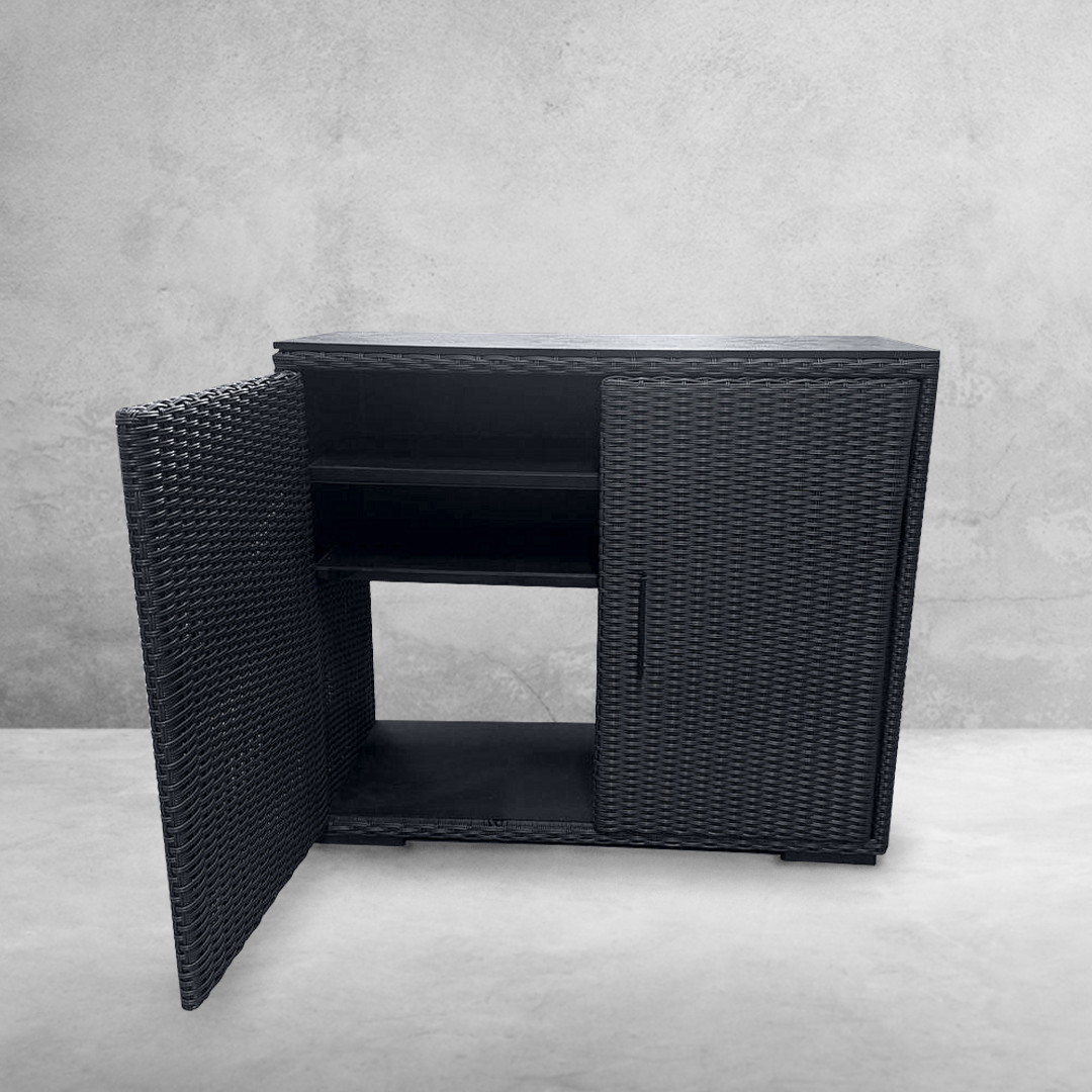 Комод  CHEST на металлическом каркасе, плетеный из искусственного ротанга.  Изготовлен из профильной трубы 20х20 мм, толщина стенки 1,2 - 1,5 мм. Полки шкафа могут быть изготовлены их каленого стекла, ДСП, HPL или металла.  Изготавливается под заказ.