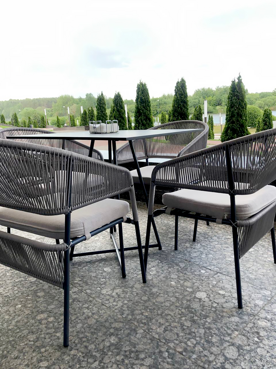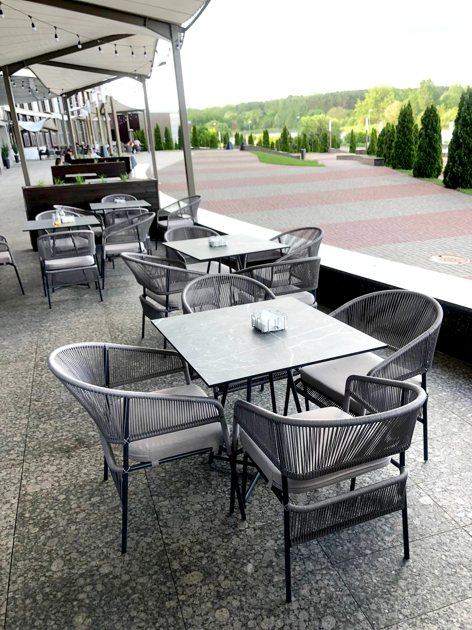 Обеденный стол MARIO на металлическом подстолье с квадратной столешницей. Подстолье изготовлено из профильной трубы 80 мм, с толщиной стенки 1.5 мм. Посмотреть комплект MARIO со стульями OBBI в интерьере террасы ресторана можно тут.