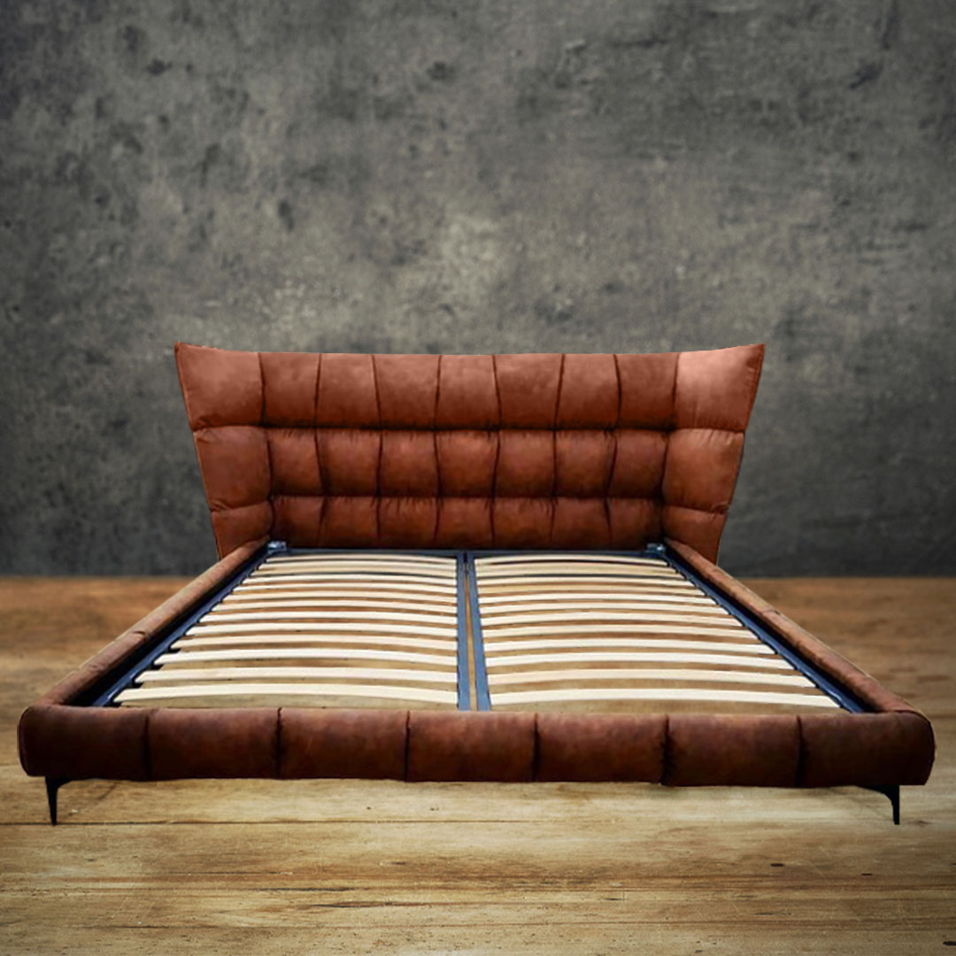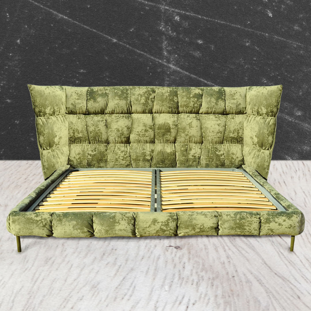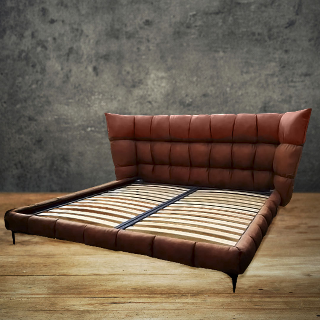 Модель кровати COSY на деревянном каркасе с обивкой из экокожи. Мягкое изголовье кровати выполнено утопленным декоративным швом. Опорой каркаса служат металлические ножки, могут быть изготовлены из массива дуба, ясеня или березы, на Ваше усмотрение.