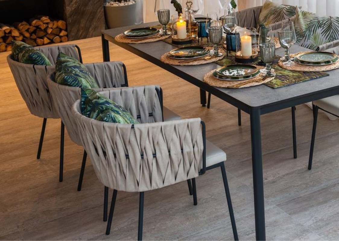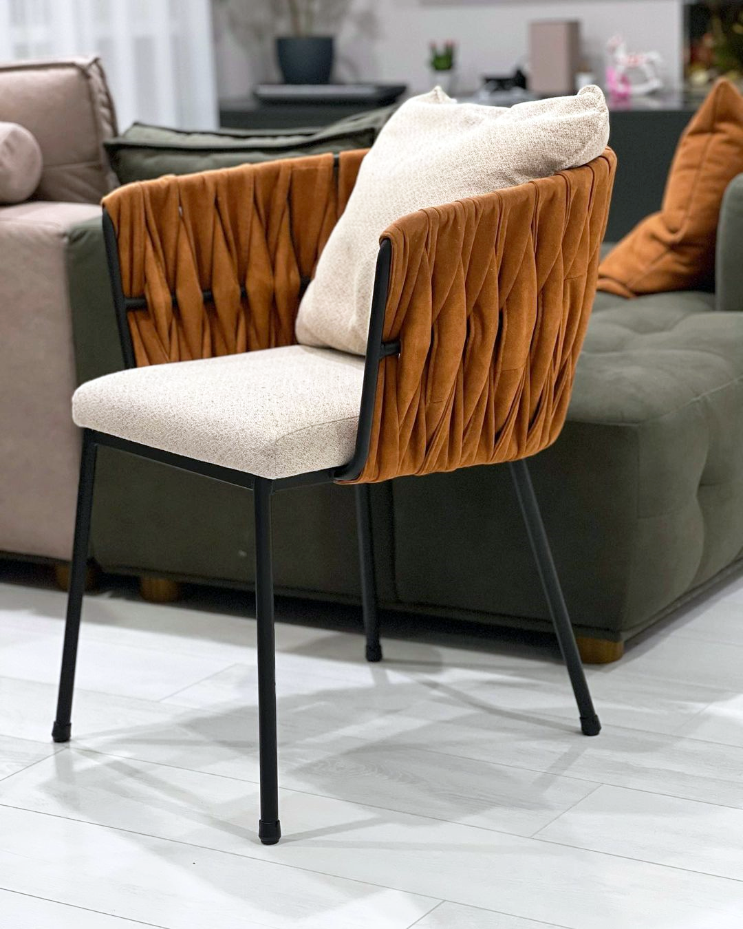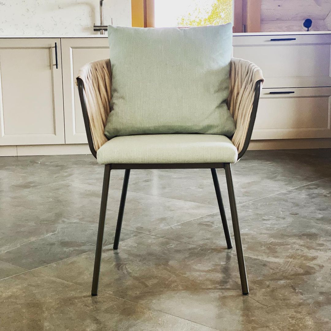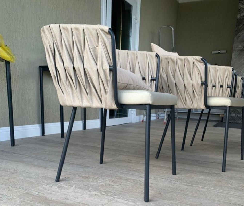 Обеденный плетеный стул FABRIK из экозамши, на металлическом каркасе. Материал обивки - велюр. Внутреннее наполнение мягких элементов стула изготовлено из двух слоев поролона различной плотности и мягкости.  Стул FABRIK идеально дополнит любую обеденную группу на террасе, кухне, в кафе или ресторане. По желанию заказчика, размер изделия, цвет и материал мякгих элементов и плеьения можно изменить.