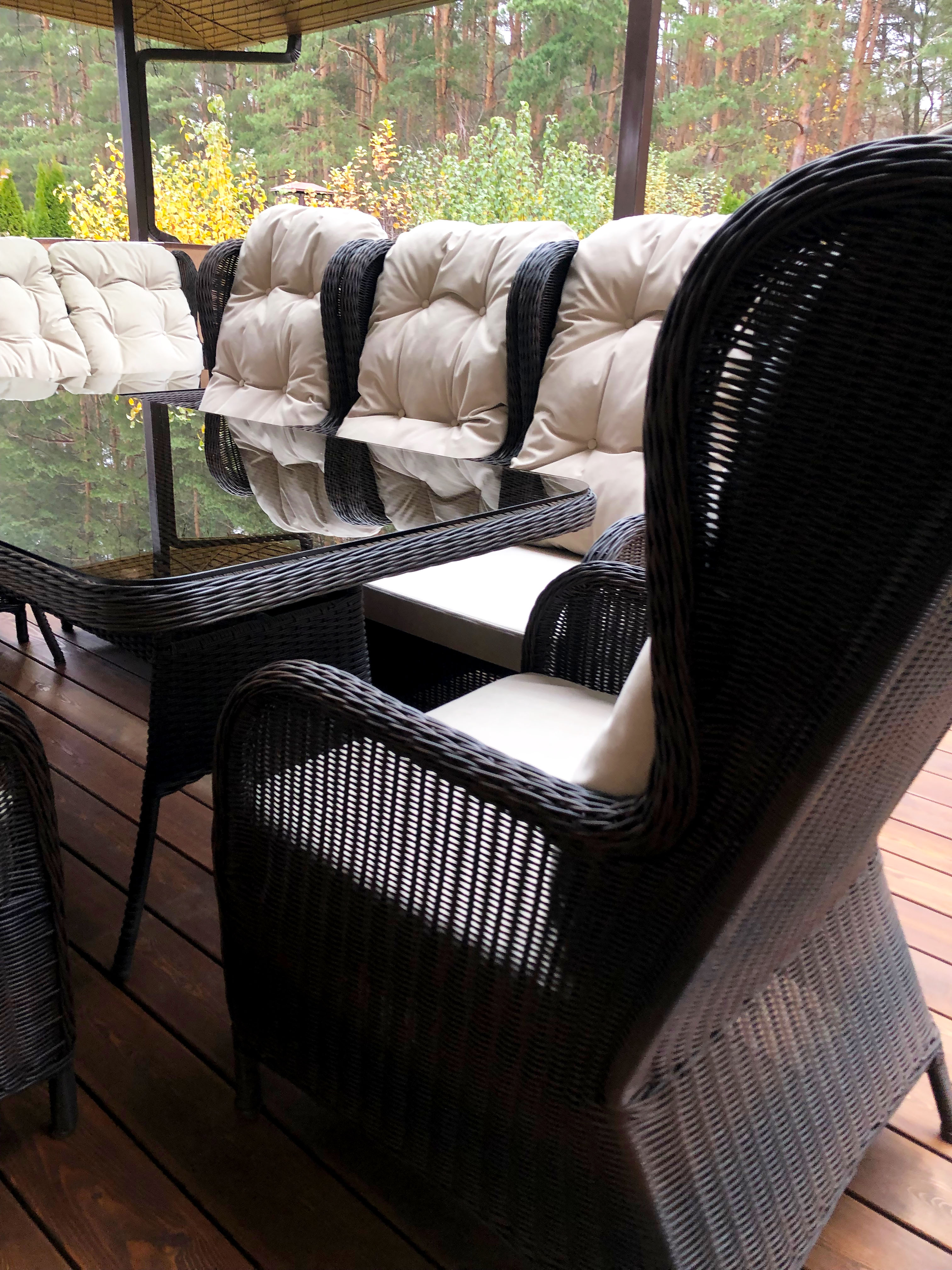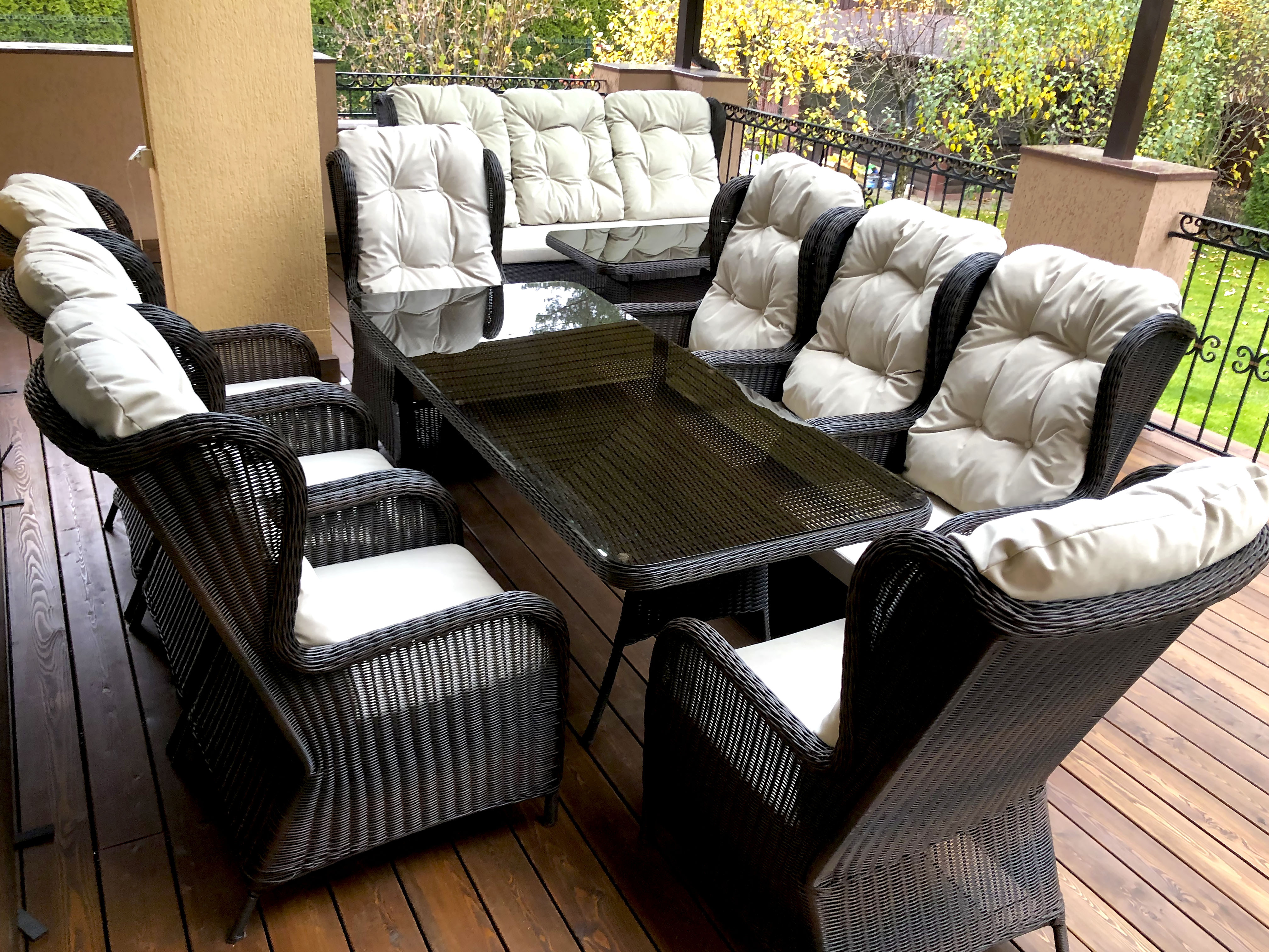 Комплект уличной мебели MORNING Lounge рассчитан на 11 персон и включает в себя: трехместный диван 220*92*112 см, кресла (8 шт) 64*92*112 см, обеденный стол 210*90*75 см и кофейный столик 120*70*60 см. Мягкие элементы входят в комплект. Террасная мебель от Филини Мебель - идеальное решение для интерьера Вашей террасы, веранды, беседки или сада.
