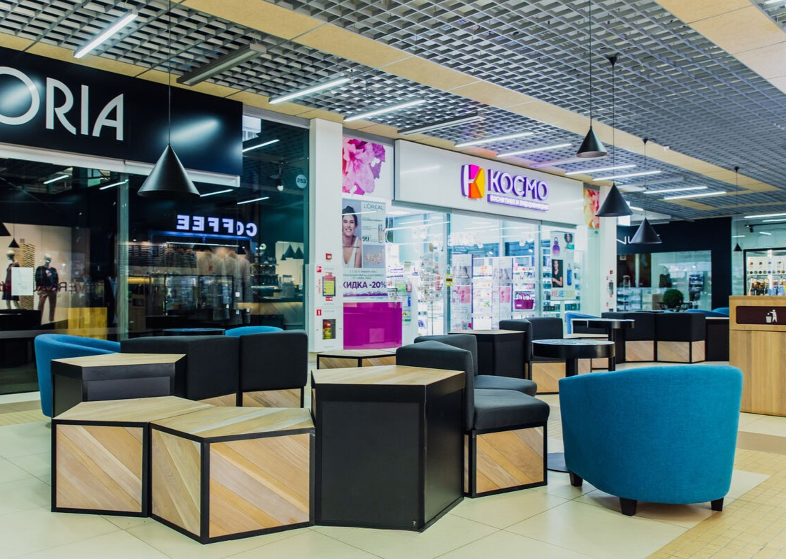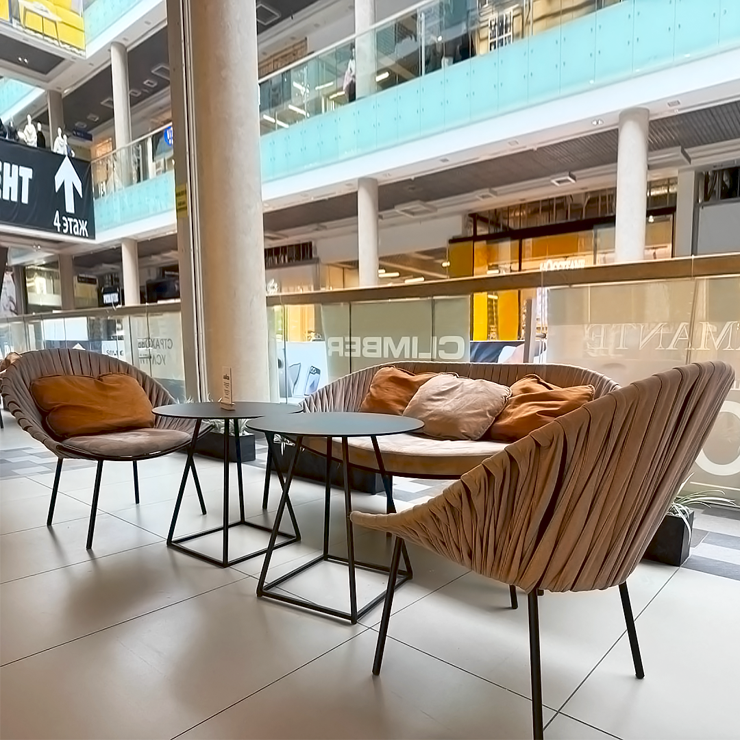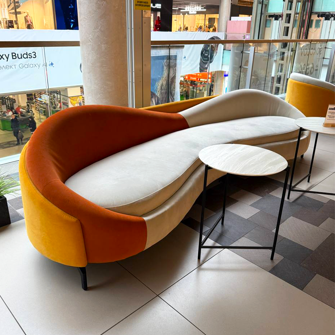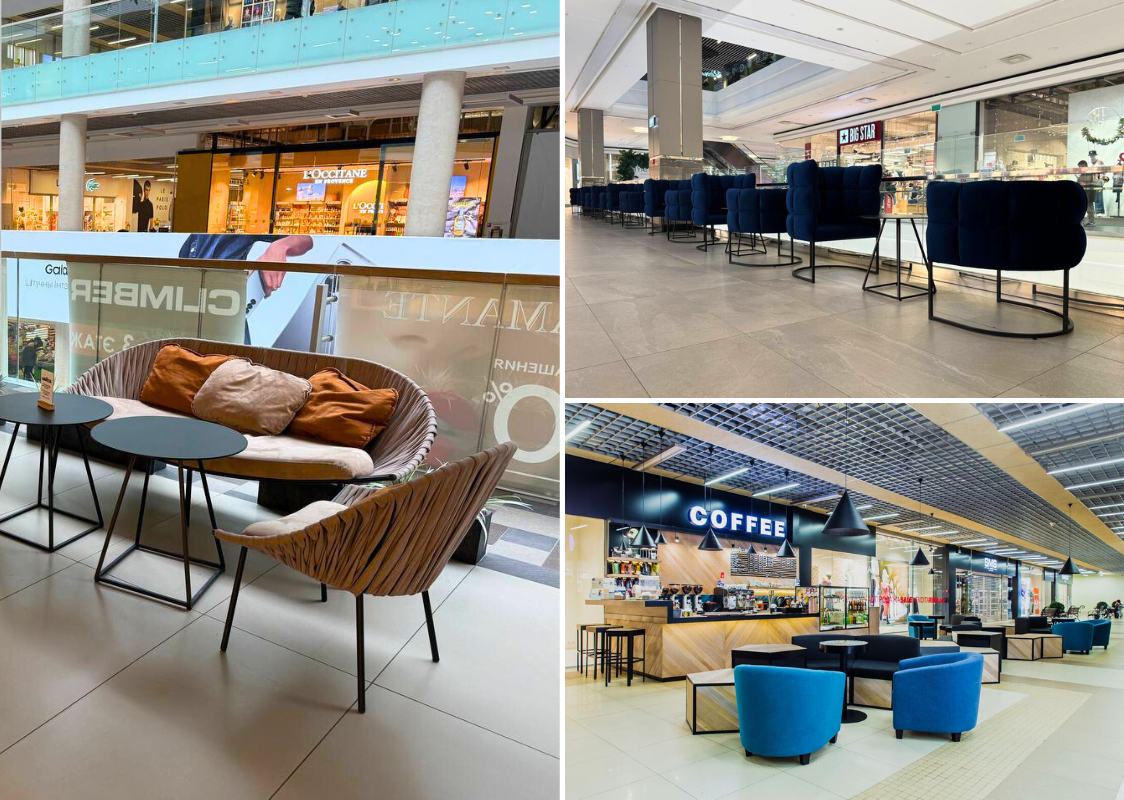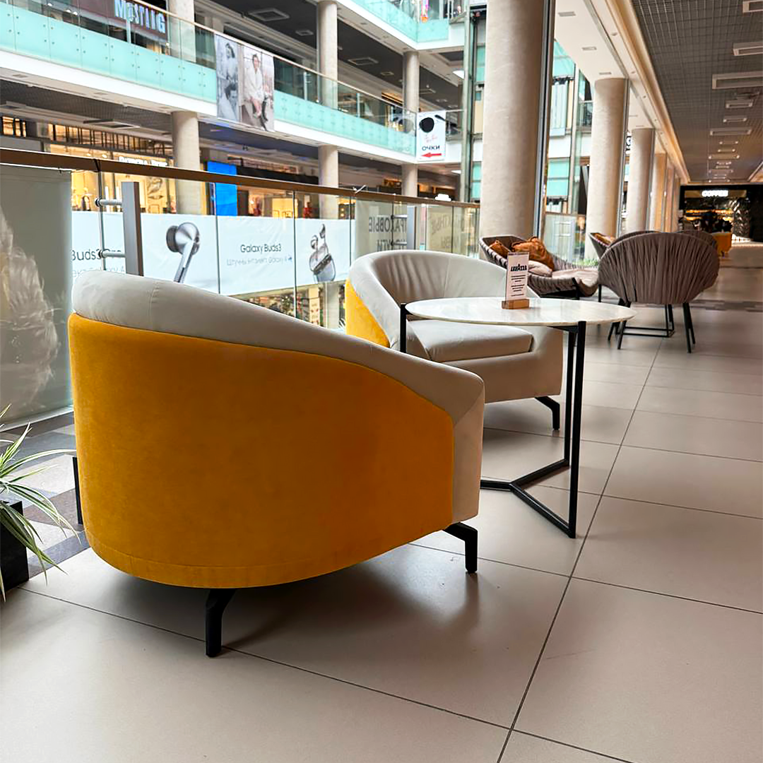 Проект реализован в кофейных точках LAVAZZA в открытом пространстве ТЦ в Минске. Металлический или деревянный каркас, материал обивки - велюр.