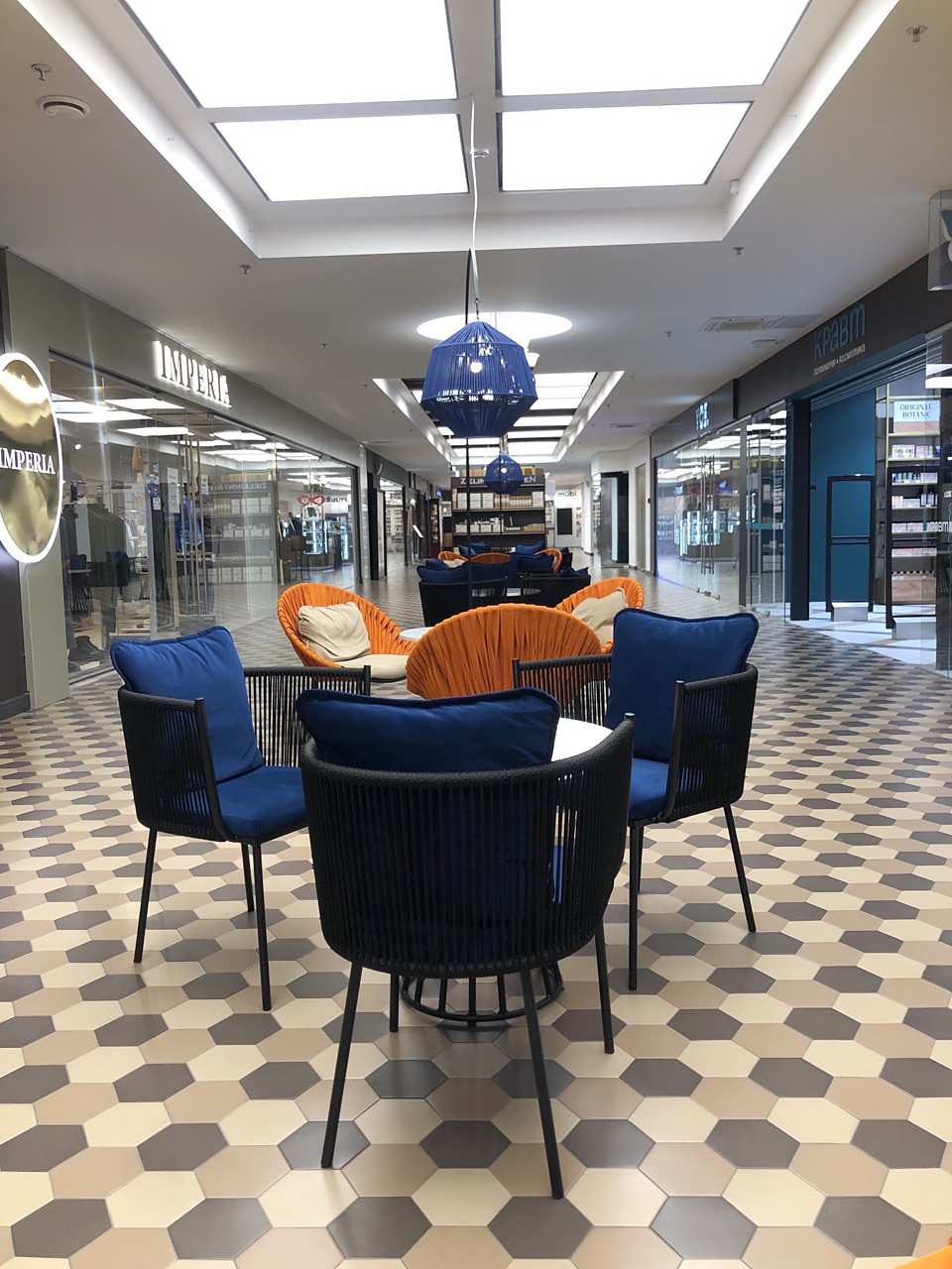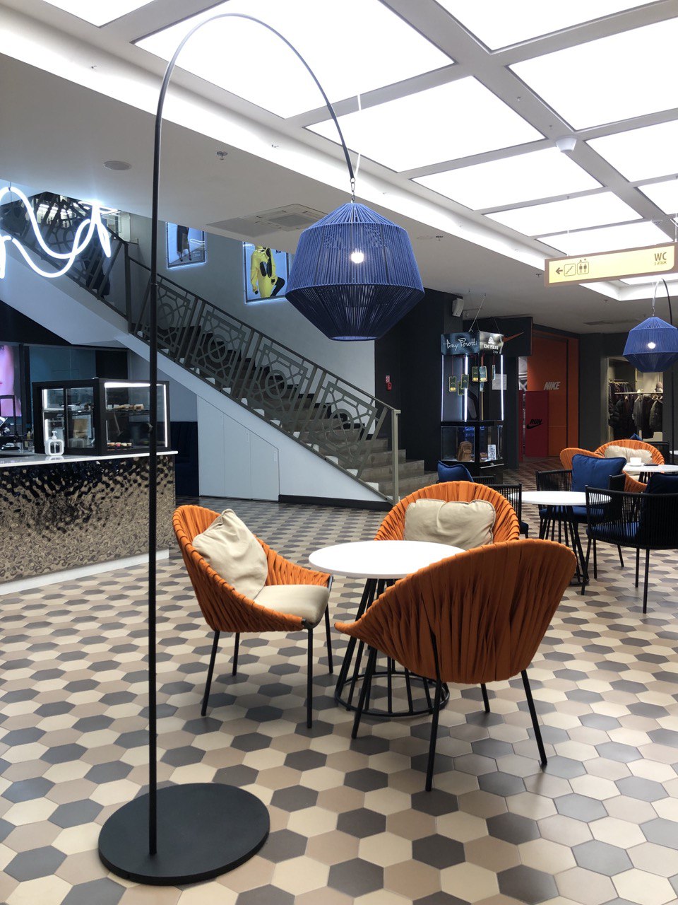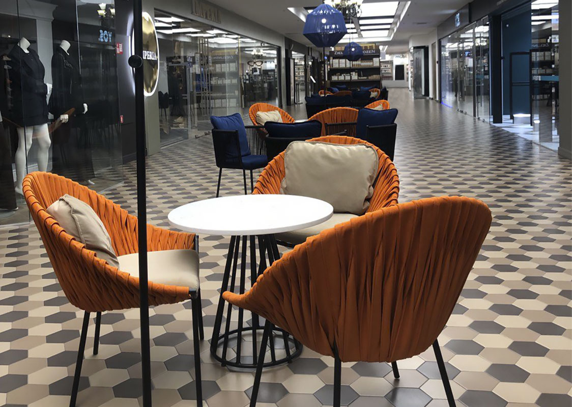 Данный проект реализован в ТЦ Метрополь на открытом пространстве кофейни LAVAZZA в Минске. Плетеные кресла и стулья изготовлены из металла, материал обивки - велюр. Кофейный столик на металлическом подстолье с каменной столешницей. Высокий торшер на подставке из металла, плетеный из синтетического шнура.