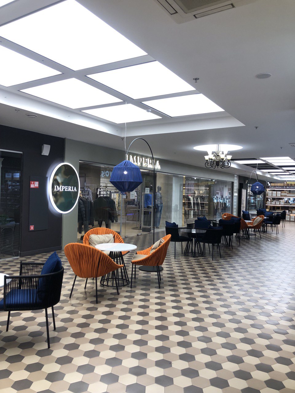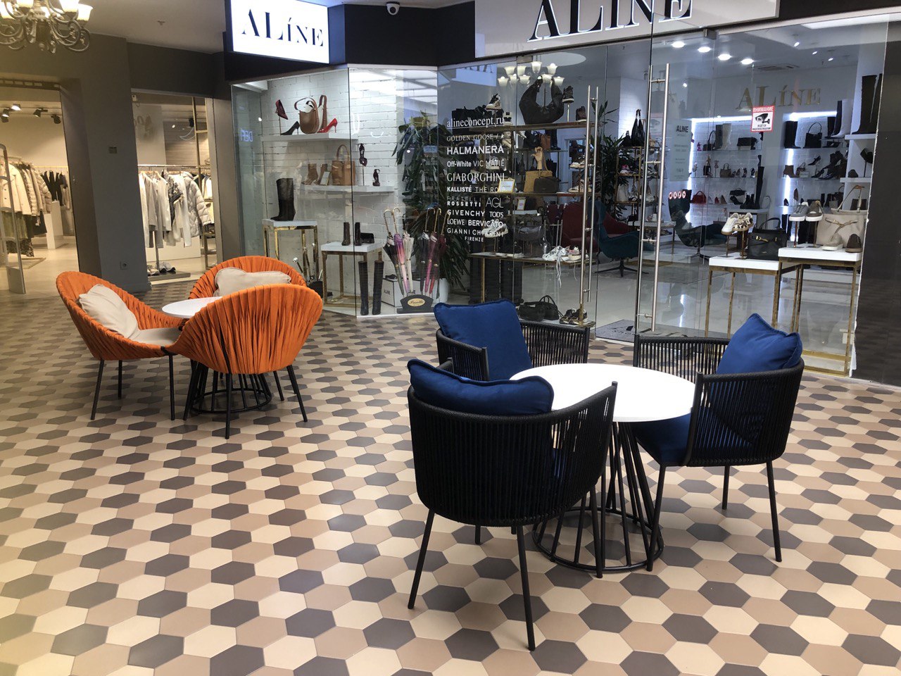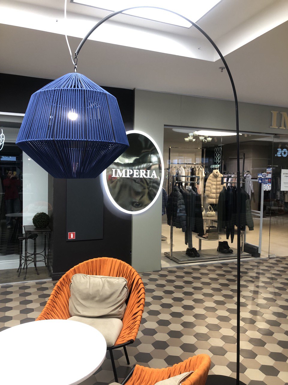 Данный проект реализован в ТЦ Метрополь на открытом пространстве кофейни LAVAZZA в Минске. Плетеные кресла и стулья изготовлены из металла, материал обивки - велюр. Кофейный столик на металлическом подстолье с каменной столешницей. Высокий торшер на подставке из металла, плетеный из синтетического шнура.