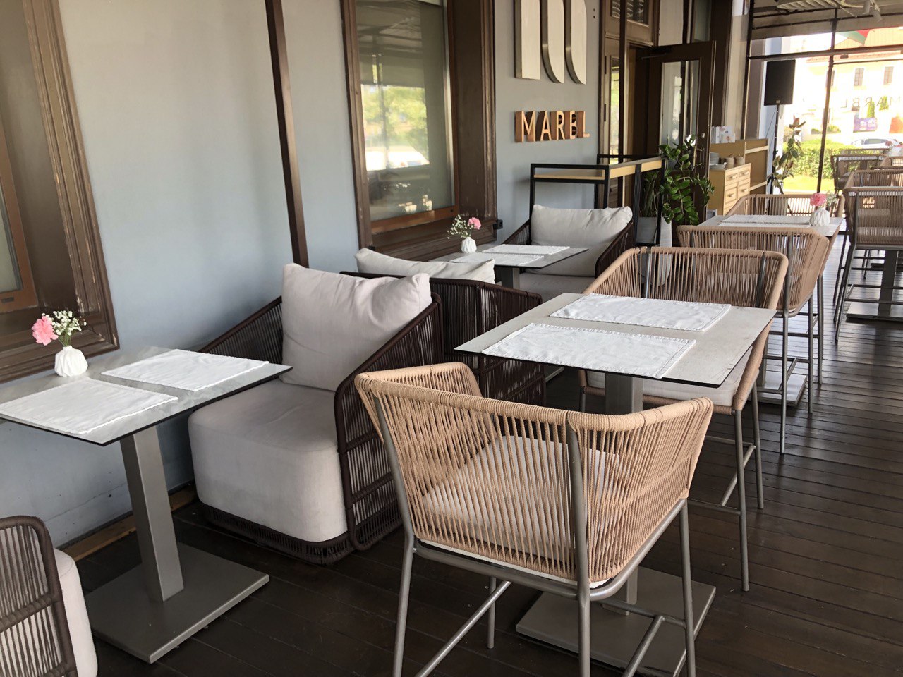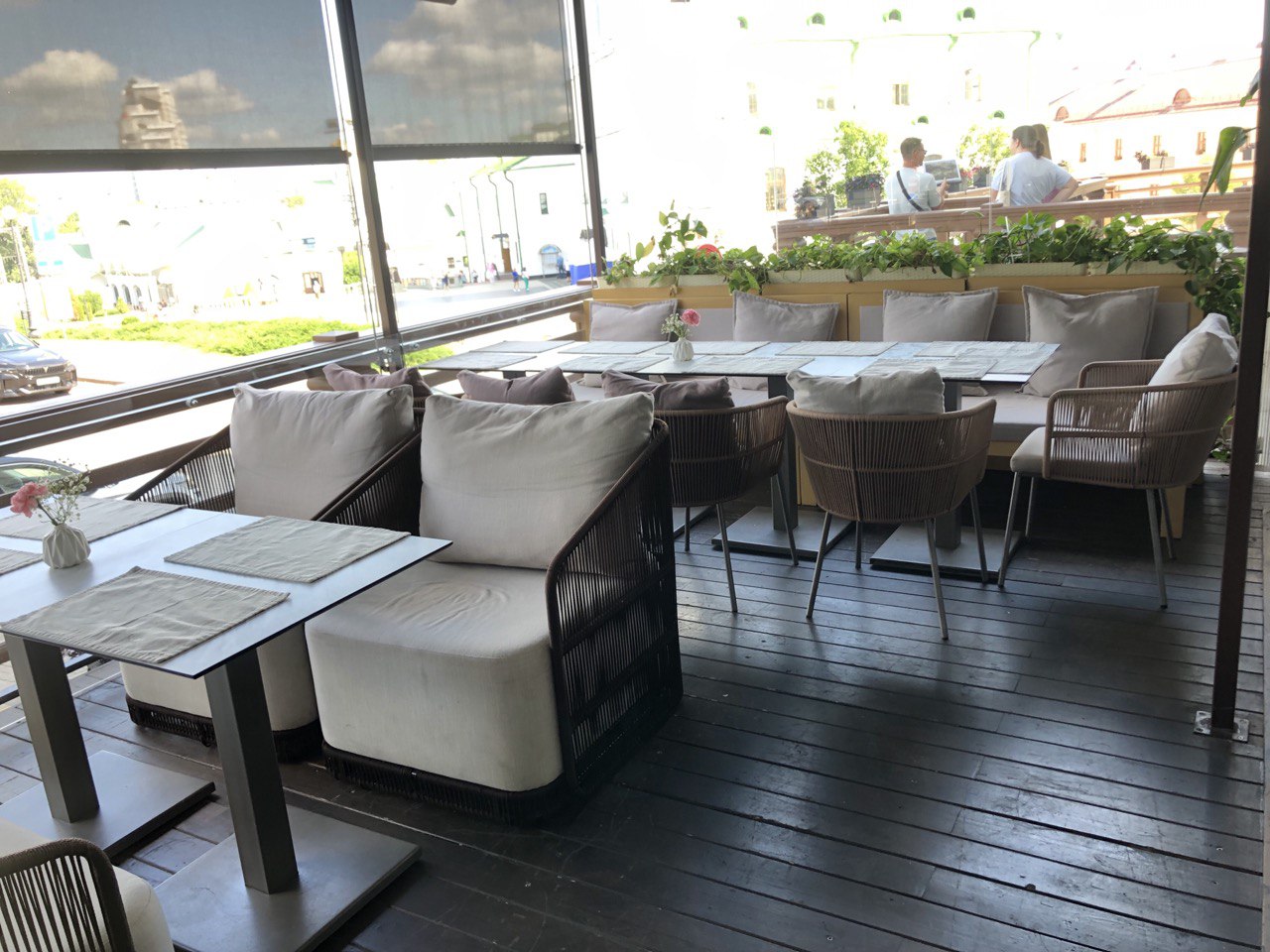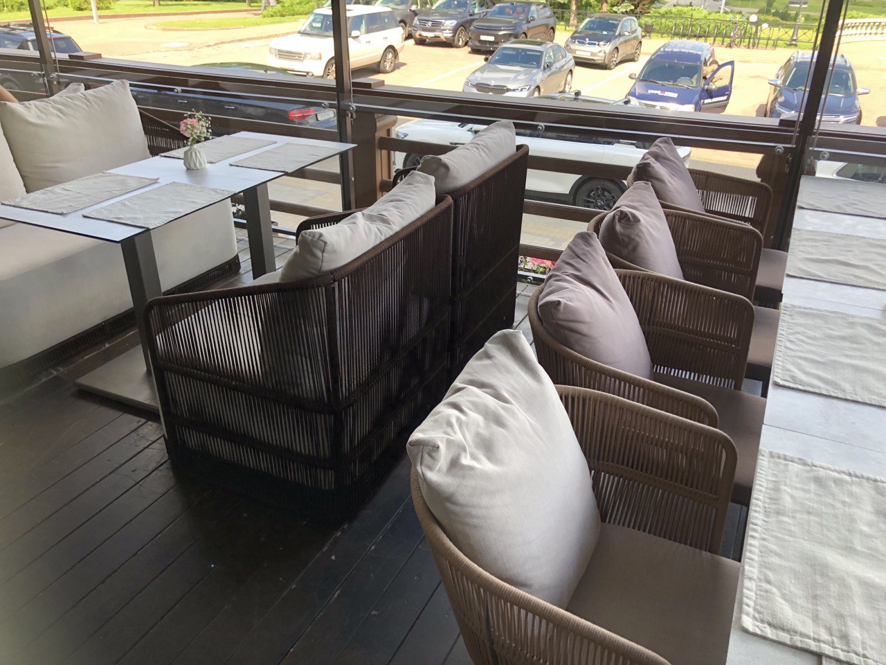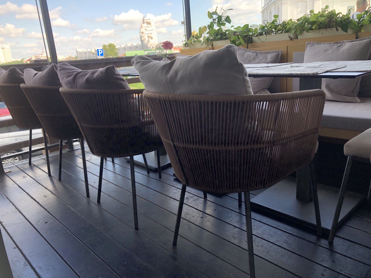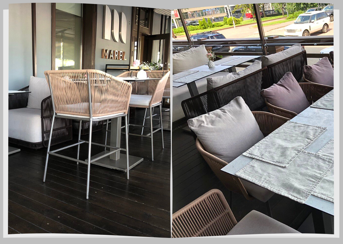 Комплект уличной мебели для террасы реализован в ресторане MARBL в Минске. Садовый набор мебели из синтетического шнура включает в себя: обеденные стулья Fabrik Rope, диван и кресла коллекции Marbl, уличный полубарный гарнитур Iris. Каркас изделий выполнен из металла. Мягкие элементы, с подушками на молнии, изготовлены из водоотталкивающей и экологичной ткани. Мебель HoReCa от Филини Мебель - идеальное решение для бара кафе или ресторана.