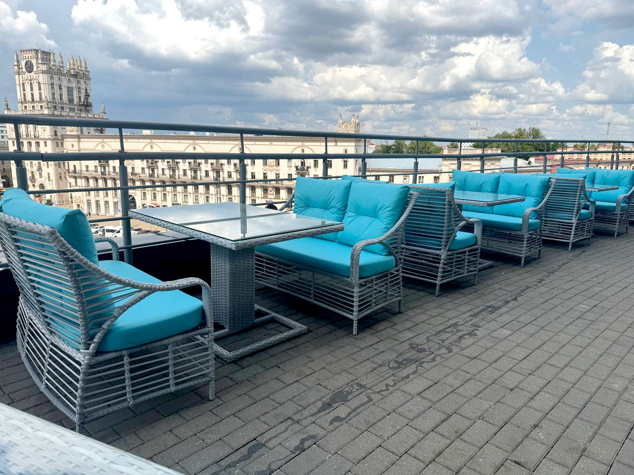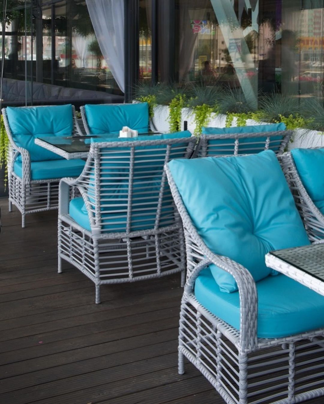 Комплекты садовой мебели из искусственного ротанга и джута успешно реализован на террасе сети ресторанов "GanBei" в ТРЦ GALILEO и ТРЦ GREEN в 2024г. В комплекте: кресла, обеденные стулья, 2-местные диваны и металлические столы. Каркас - металл, с полимерным покрытием. Мягкие элементы из водоотталкивающей ткани, предназначены специально для мебели на открытом пространстве.