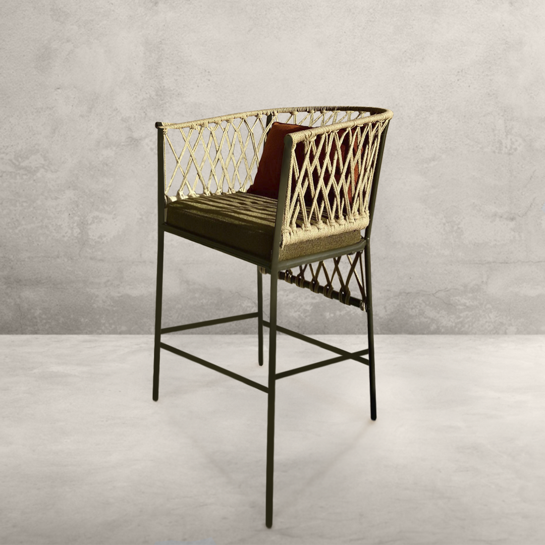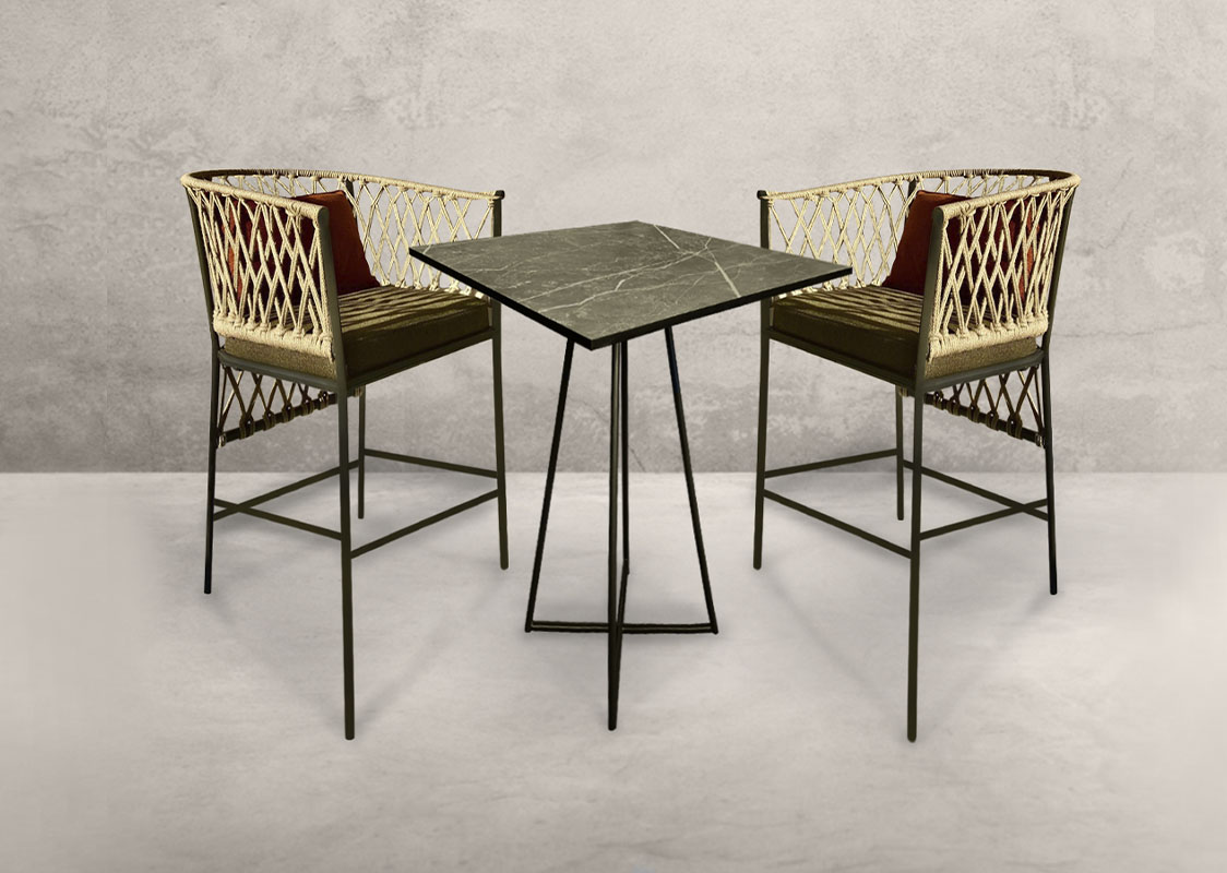 Барный комплект садовой мебели DJUT на 2 персоны включает в себя 2 барных стула 56х55х110 см и барный стол 70х70х106 см. Идеальный вариант для террасы, беседки, веранды, а так же для ресторана бара или кафе. Мягкие элементы входят в комплект. Материал плетения - джут. К заказу принимаем любую комплектацию и размер. Возможно изменить цвет, текстуру и материал плетения.