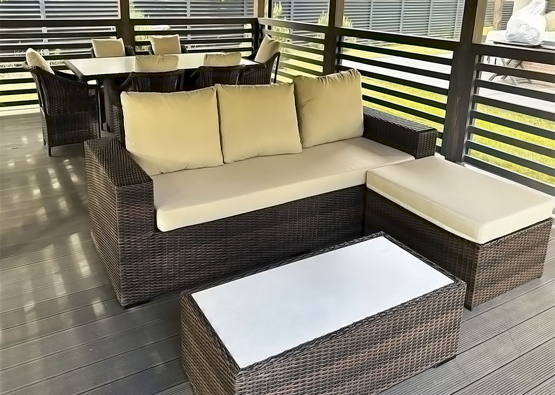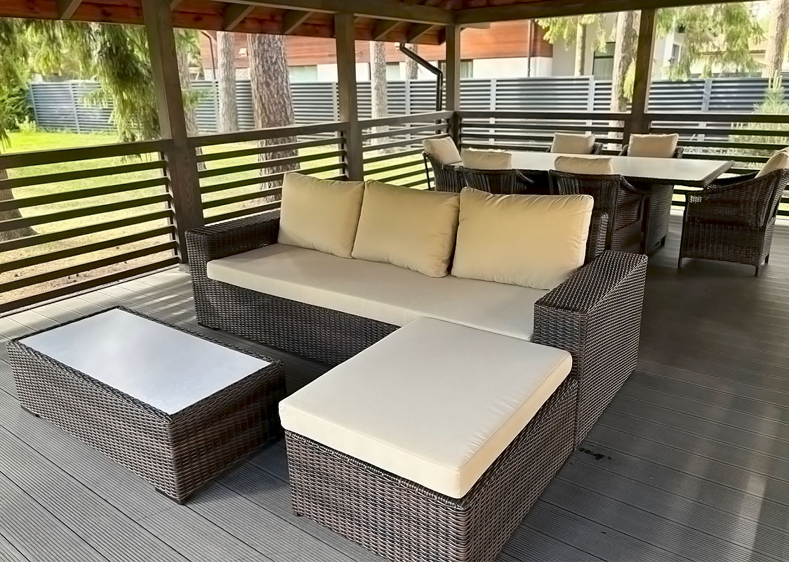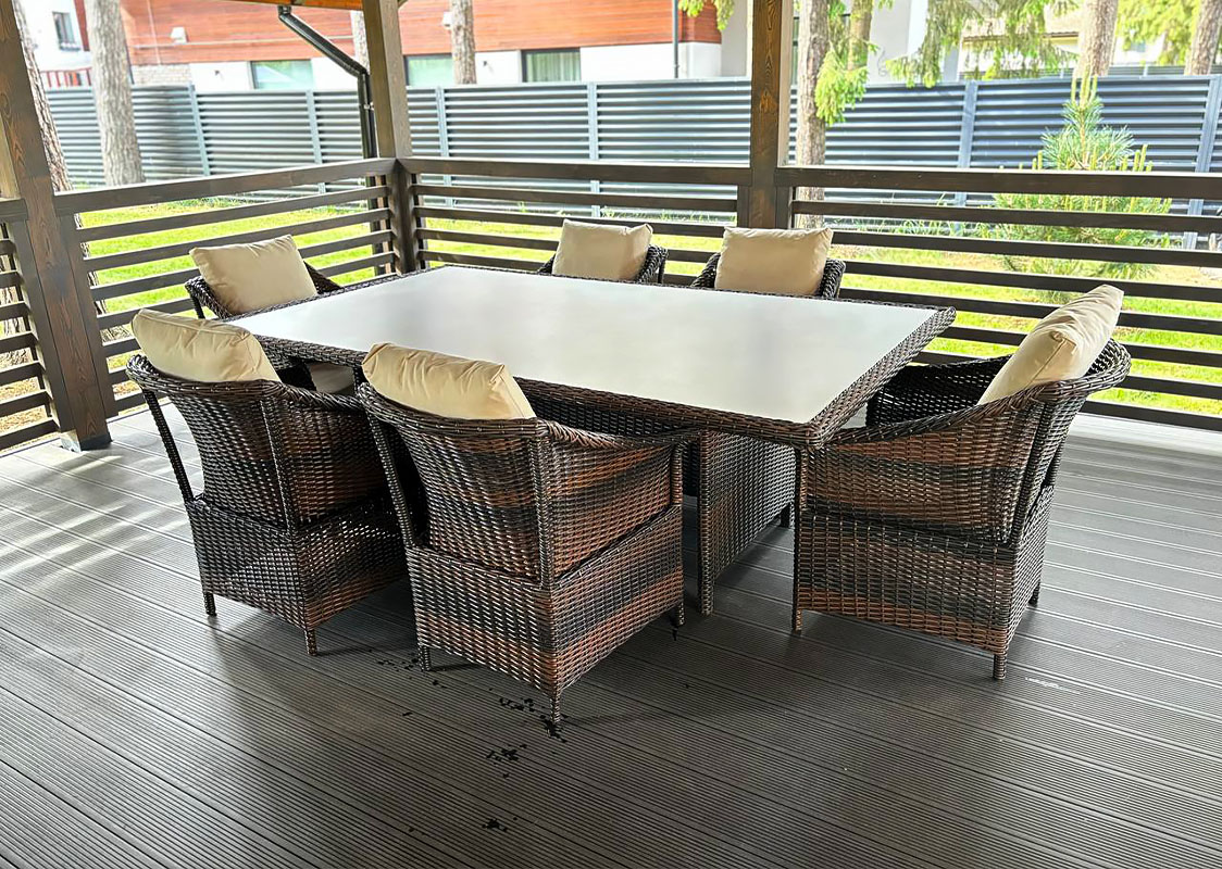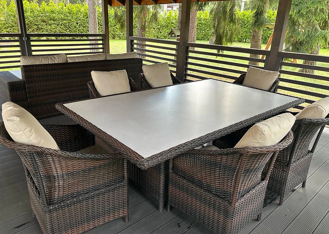 Комплект плетеной мебели BEREZKA Lounge рассчитан на 10 персон. Включает в себя 6 кресел 70х70х82 см, обеденный стол (столешница - керамическая плита) 216х126х75 см, 3-местный диван 250х90х90 см, пуф 90х70х45 см, журнальный столик 126х56х35 см. К заказу принимаем любую комплектацию и размер. Возможно изменить цвет, текстуру искусственного ротанга и материал плетения.