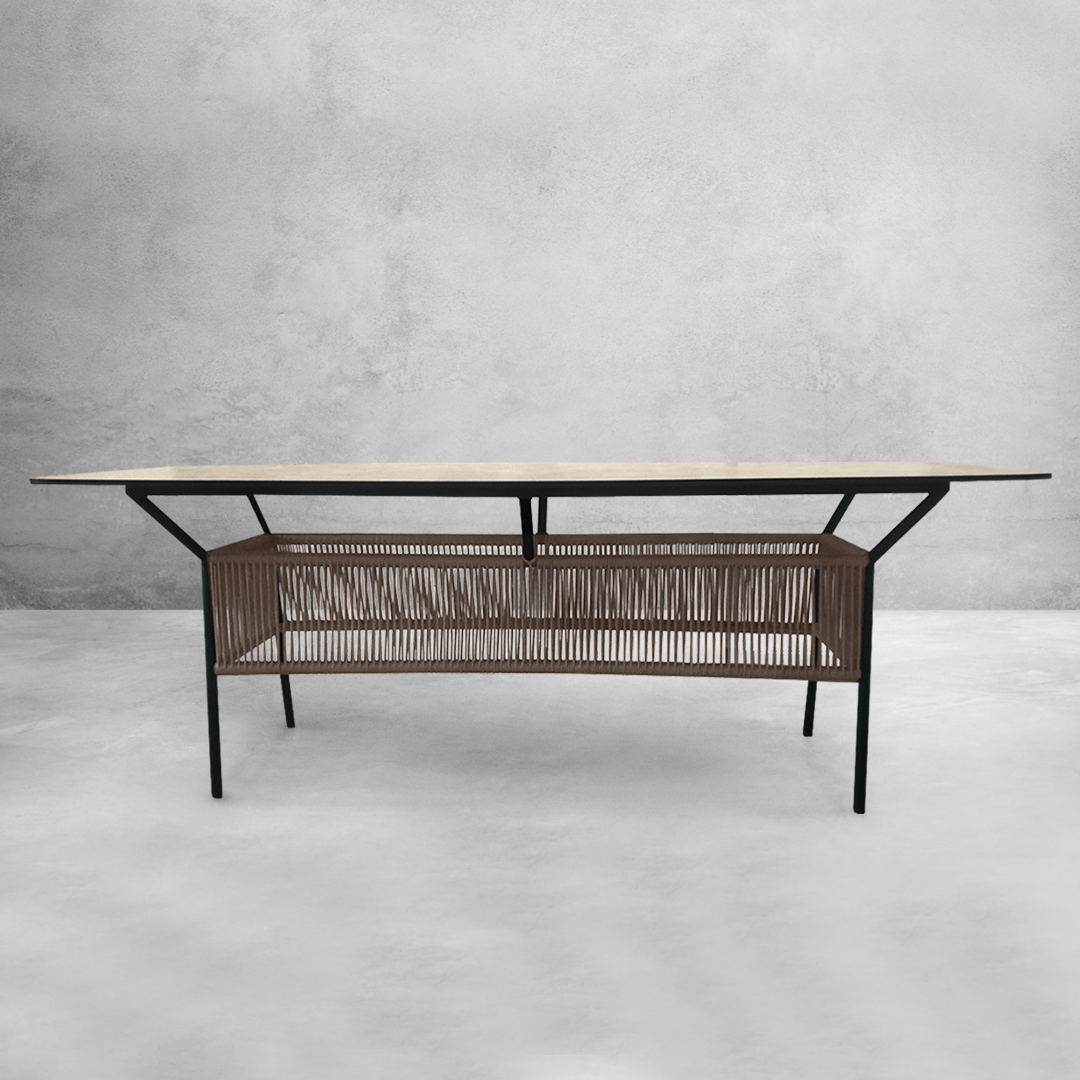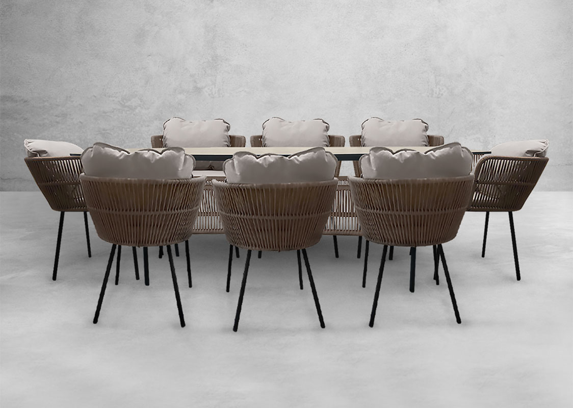 Комплект уличной мебели FABRIK Cloud на 8 персон, включает в себя стулья 59х56х70 см и обеденный стол 200х90х77 см. Садовая мебель коллекции FABRIK Rope станет идеальным решением для Вашей террасы, беседки, веранды, сада или лаунж зоны. Внутреннее наполнение мягких элементов изготовлено из поролона различной степени плотности. Материал мягких элементов: велюр. Столешница выполнена из HPL. Мягкие элементы входят в комплект изготовлены из водоотталкивающего и экологичного материала. Надёжный металлический каркас выдерживает большие нагрузки. Материал плетения: синтетический шнур. По желанию заказчика, размер, цвет и материал плетения можно изменить.