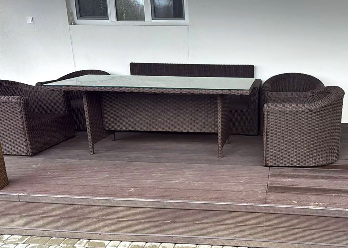 Комплект уличной мебели KOBRIN Berezka включает в себя: 4 уличных кресла 81х80х73 см; диван 3-местный 200х80х85 см; обеденные стол 200х90х75 см со стеклянной столешницей.
