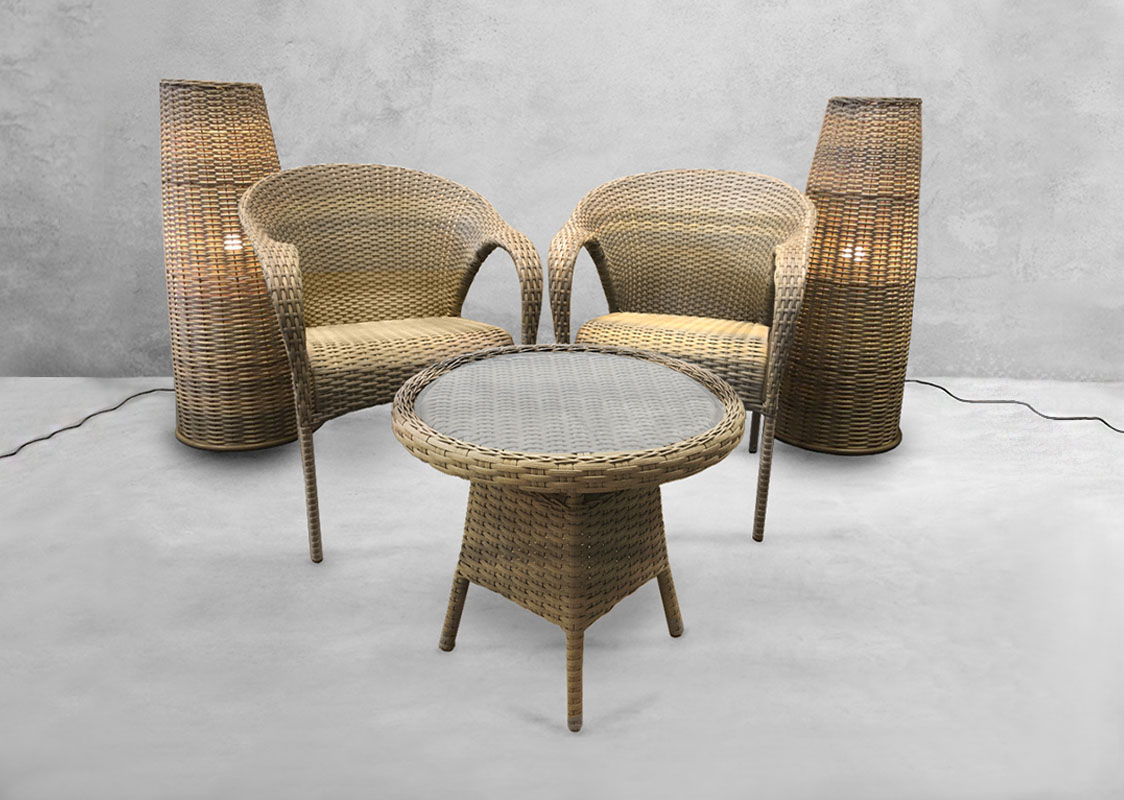 Комплект мебели на террасу MANGO Lamp включает в себя 2 обеденных стула коллекции Mango 53х61х86 см, кофейный столик Provence 60х60х50 см, абажур Lamp 42х25х100 см. К заказу принимаем любую комплектацию и размер. Возможно изменить цвет, текстуру искусственного ротанга и материал плетения.