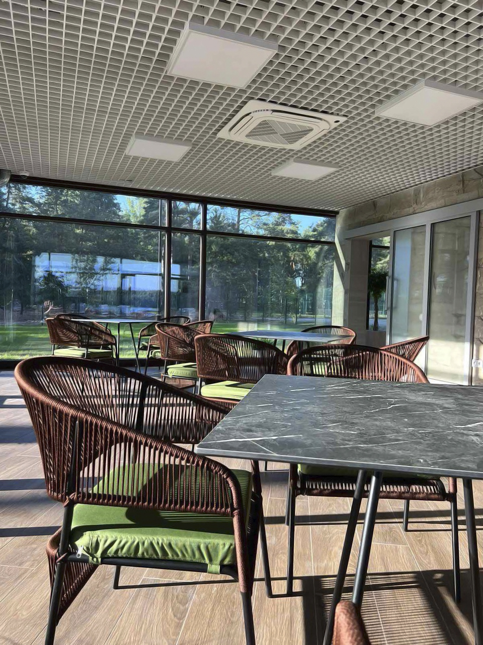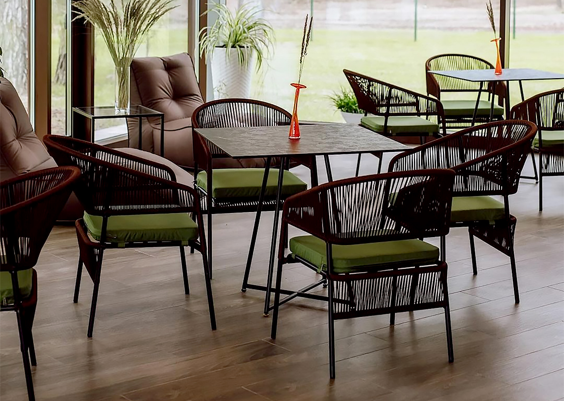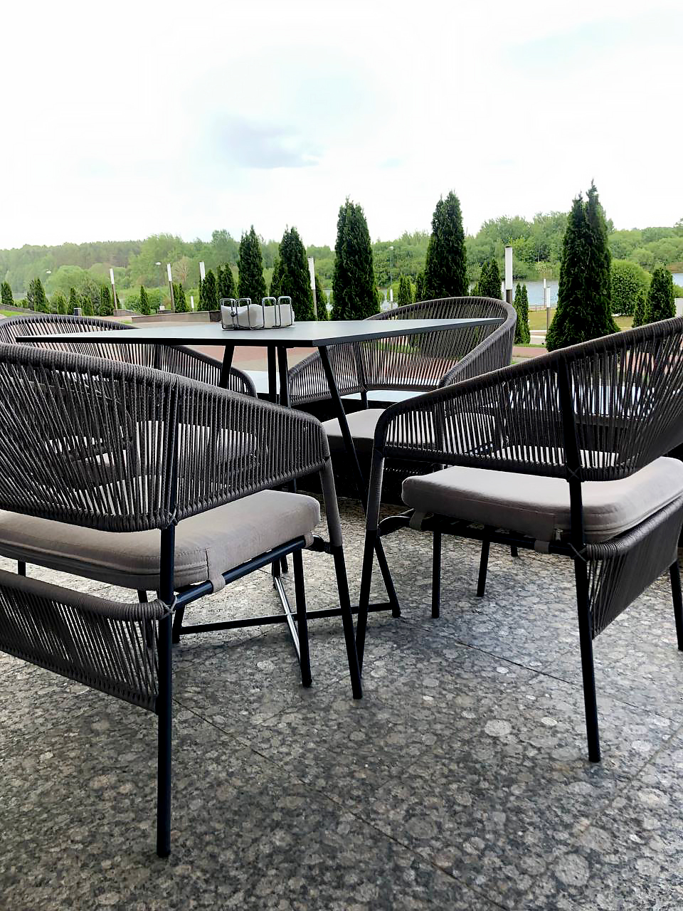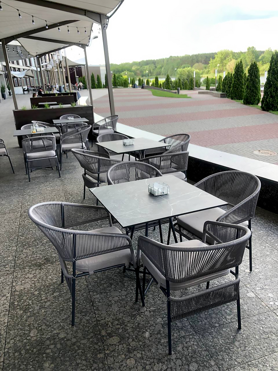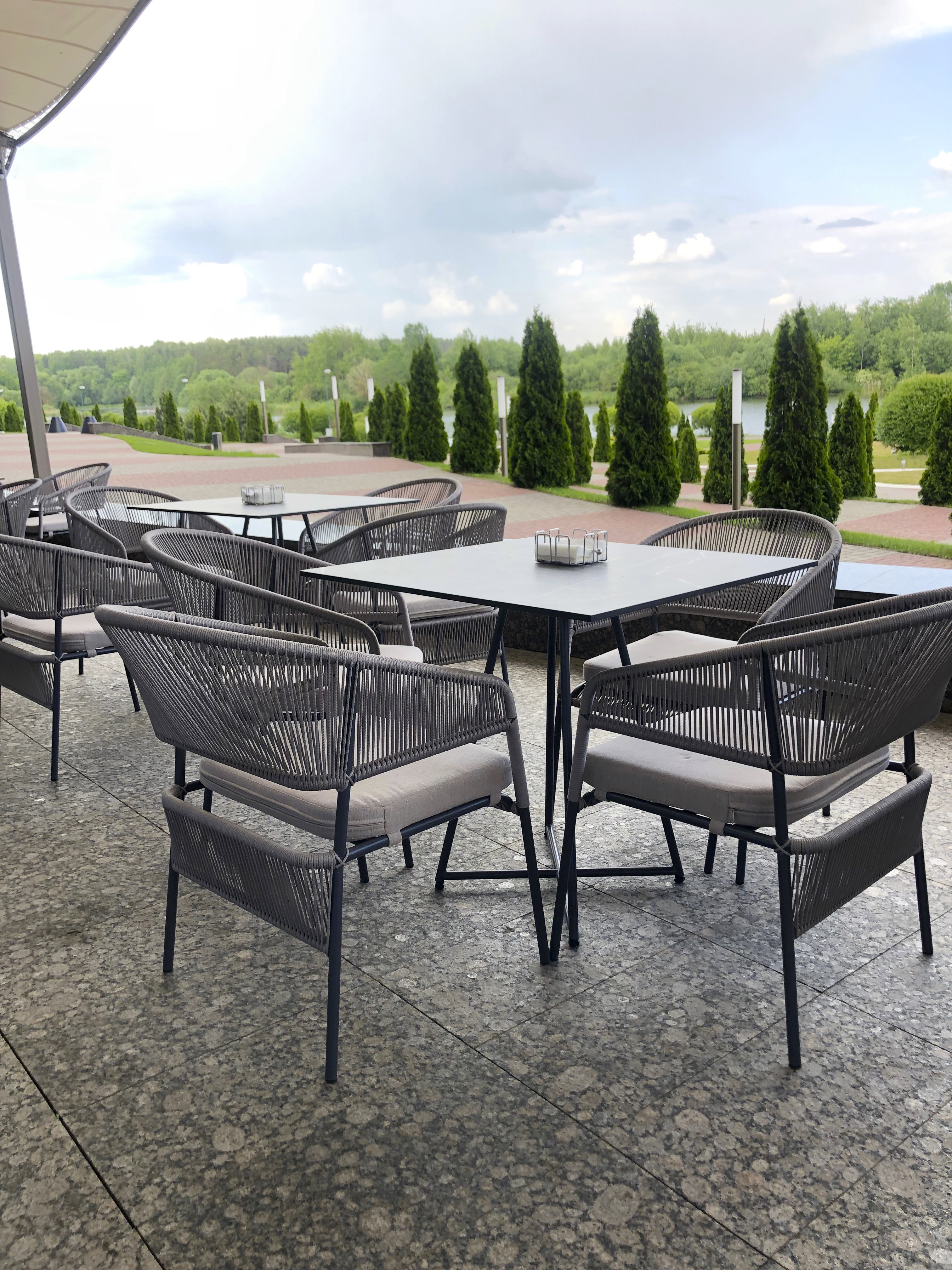 Комплект садовой мебели MARIO на 4 персоны включает в себя 4 стула 56х72х80 см и обеденный стол на металлическом подстолье 80х80х75 см со столешницей HPL. Идеально подойдет на террасу, беседку, веранду или лаунж зону, а так же в ресторан или кафе. Материал плетения - синтетический шнур. Проект реализован на террасе ресторана Fornello в отеле Marriott и в аква-зоне санатория Плисса. К заказу принимаем любую комплектацию и размер. Возможно выбрать цвет, текстуру и материал плетения.