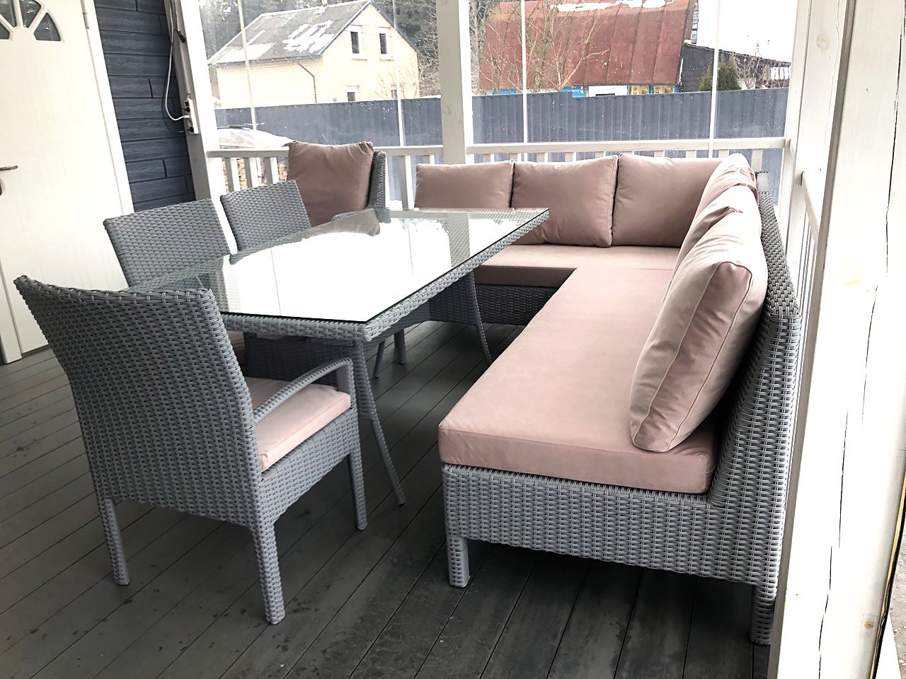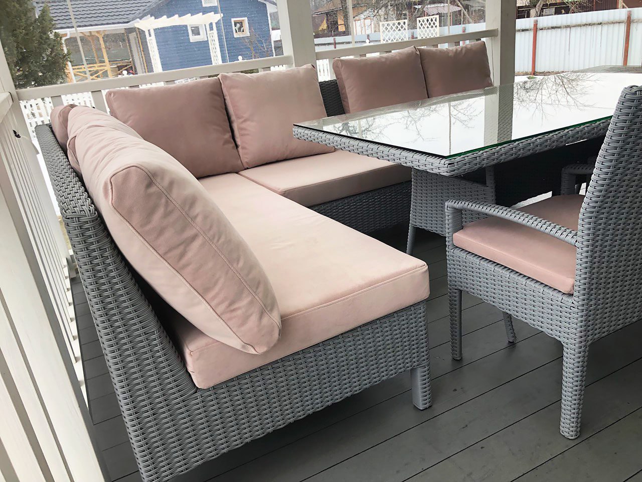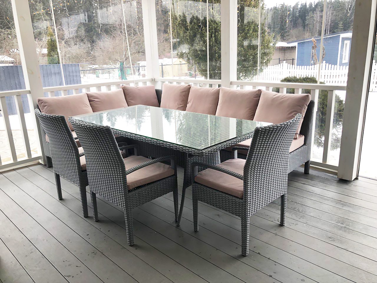 Комплект мебели на террасу MODERN Smart включает в себя 3 обеденных стула Modern 53х61х86 см, угловой диван Smart 260х180х75х80 см, обеденный стол Berezka 180х90х74 см и кресло Provence 63х76х97 см. Мягкие элементы входят в комплект. К заказу принимаем любую комплектацию и размер. Возможно изменить цвет, текстуру искусственного ротанга и материал плетения.