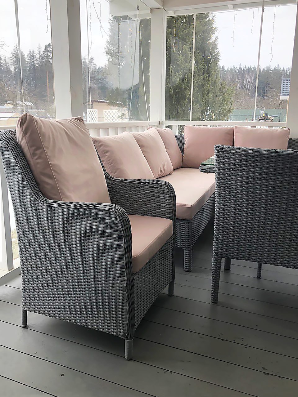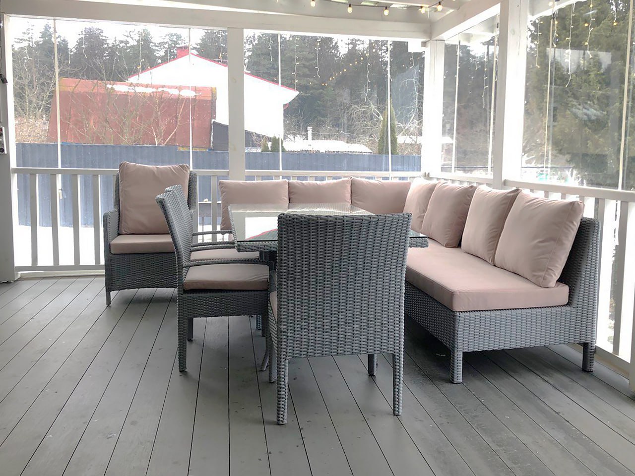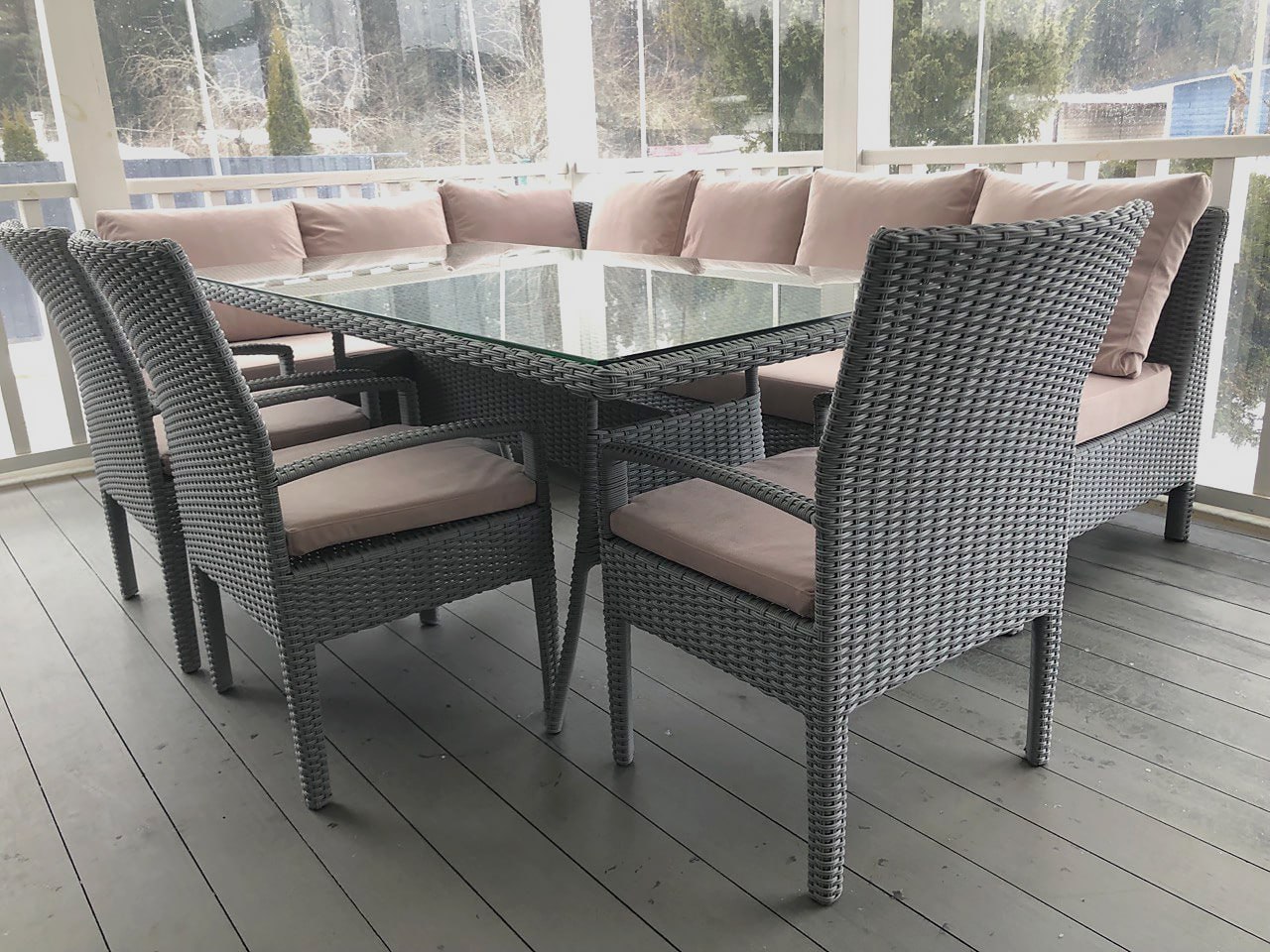 Комплект мебели на террасу MODERN Smart включает в себя 3 обеденных стула Modern 53х61х86 см, угловой диван Smart 260х180х75х80 см, обеденный стол Berezka 180х90х74 см и кресло Provence 63х76х97 см. Мягкие элементы входят в комплект. К заказу принимаем любую комплектацию и размер. Возможно изменить цвет, текстуру искусственного ротанга и материал плетения.