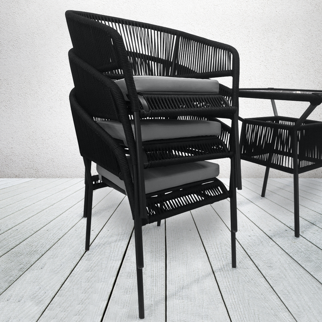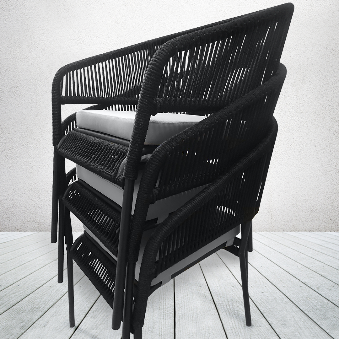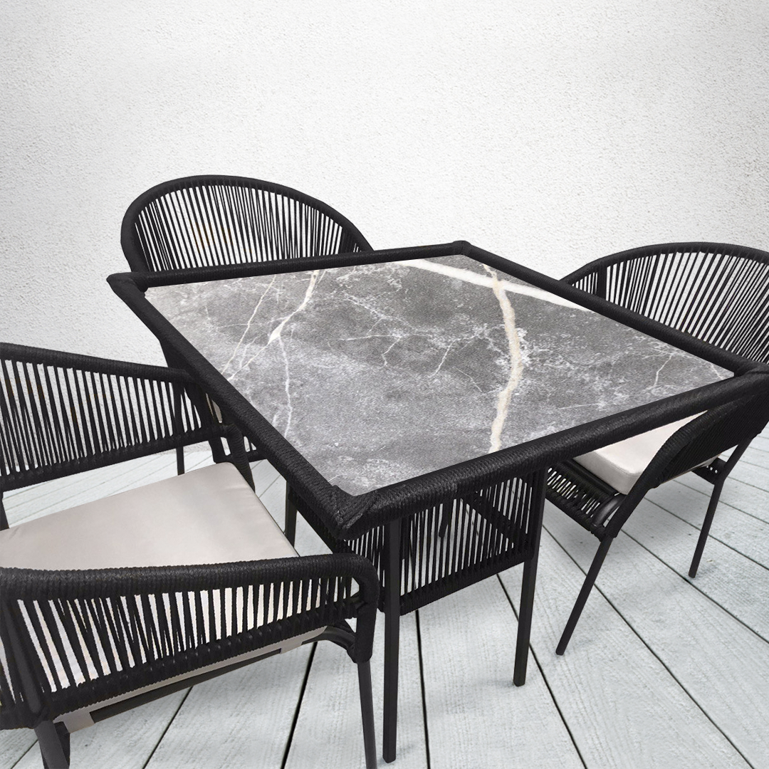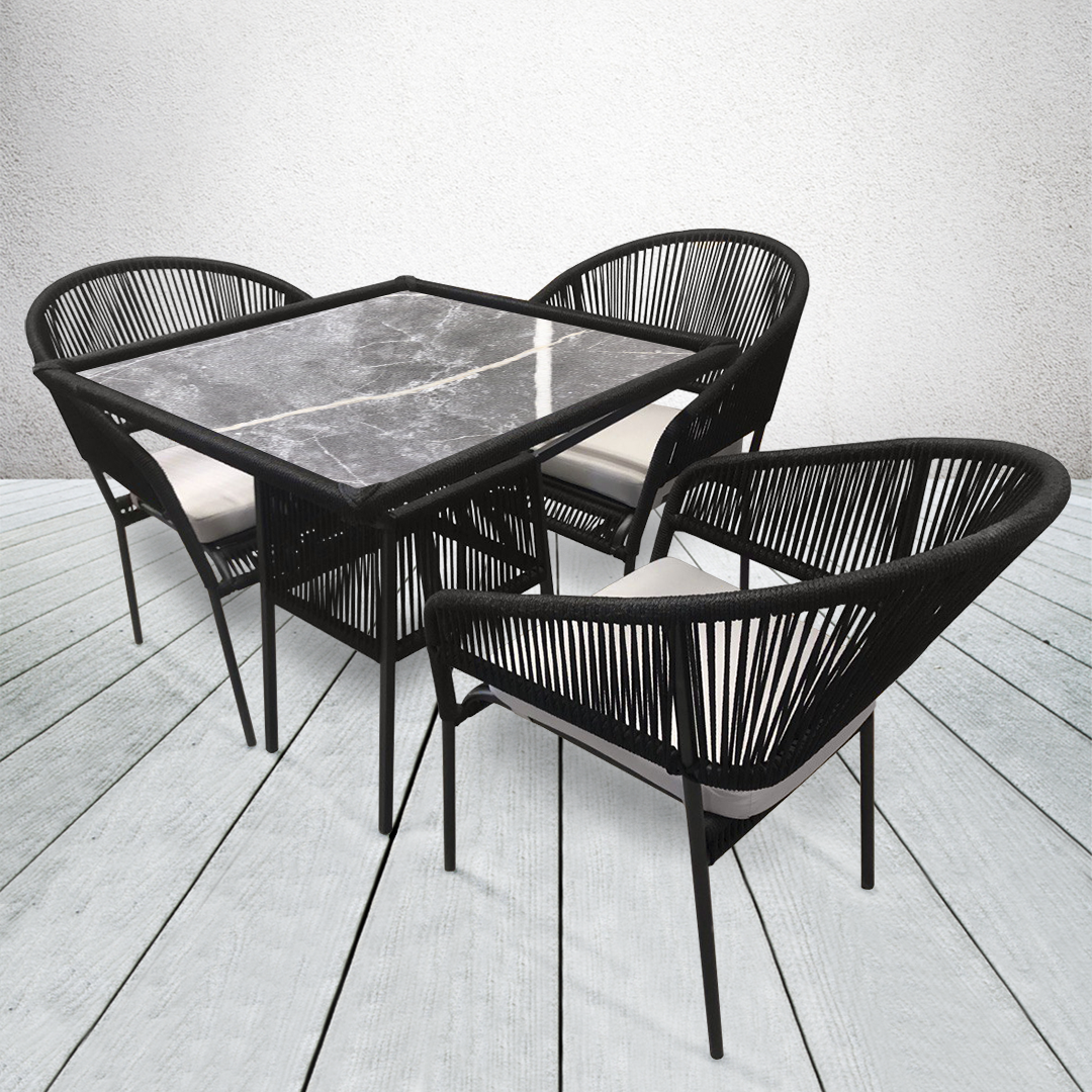 Комплект садовой мебели OBBI Cloud - это компактное и стильное решение для террасы, веранды, кафе или ресторана. Комплектация: 3 стула 56х72х80 см (штабелируемые), обеденный стол 80х80х76 см. Материал плетения - синтетический шнур. Столешница выполнена из компакт-плиты. Мягкие элементы входят в комплект. К заказу принимаем любую комплектацию и размер. Возможно изменить цвет, текстуру и материал плетения.