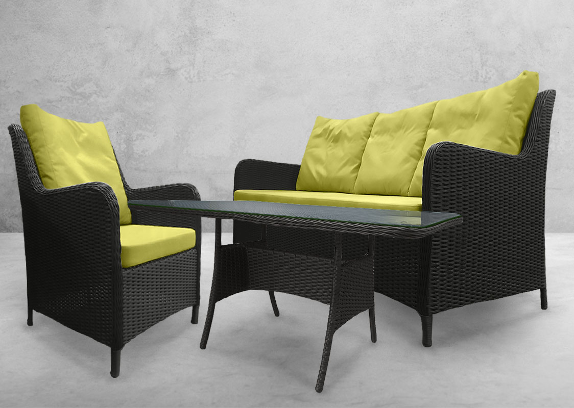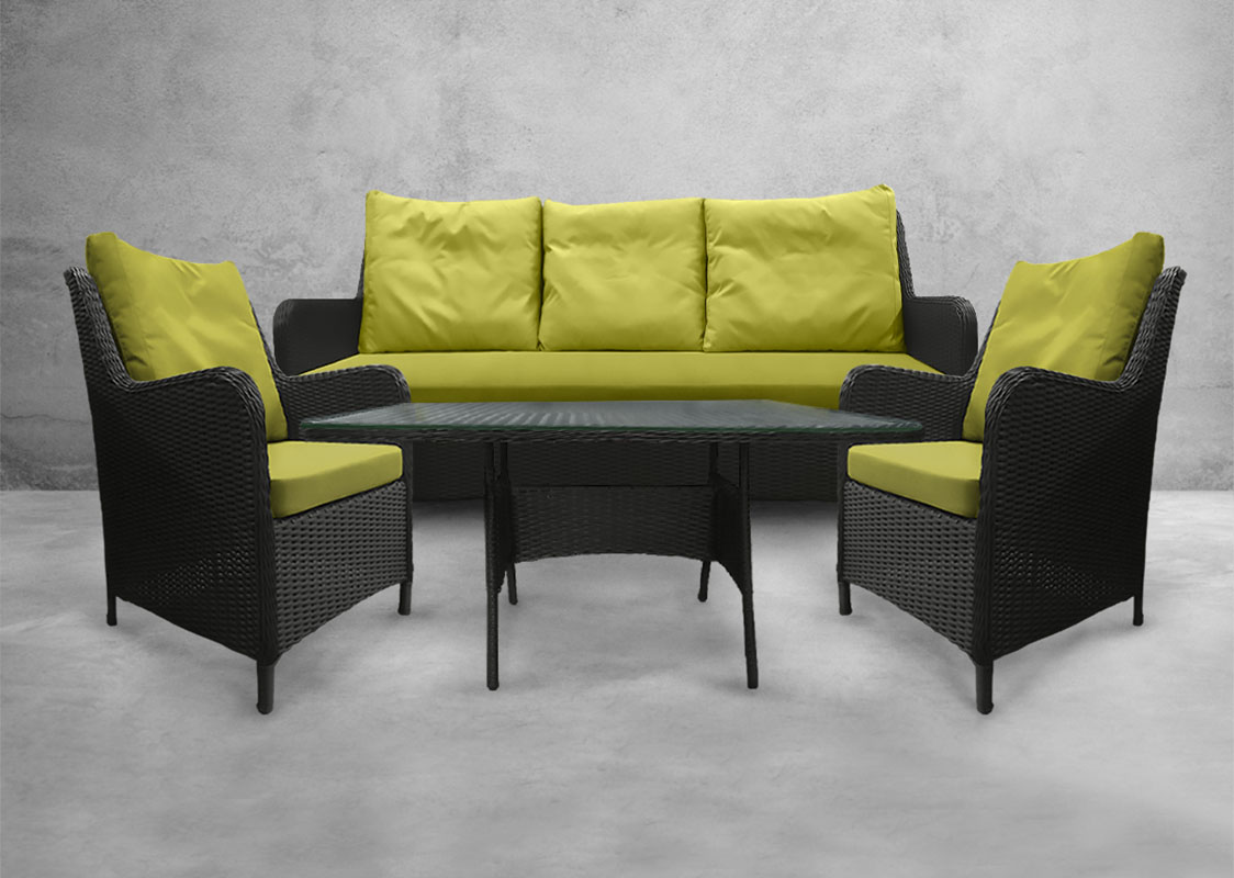 Комплект плетеной мебели PROVENCE Coffee на 5 персон. Включает в себя 2 кресла 63х76х97 см, диван 3-местный 200х76х97 см, кофейный столик 120х70х60 см. Уличная мебель коллекции PROVENCE станет идеальным решением для Вашей террасы, беседки, веранды, сада или лаунж зоны. Внутреннее наполнение мягких элементов изготовлено из поролона различной степени плотности. Материал мягких элементов: рогожка. Мягкие элементы входят в комплект и выполнены из водоотталкивающего и экологичного материала. Надёжный металлический каркас выдерживает большие нагрузки. По желанию заказчика, размер изделий, цвет подушек и материал плетения можно изменить.