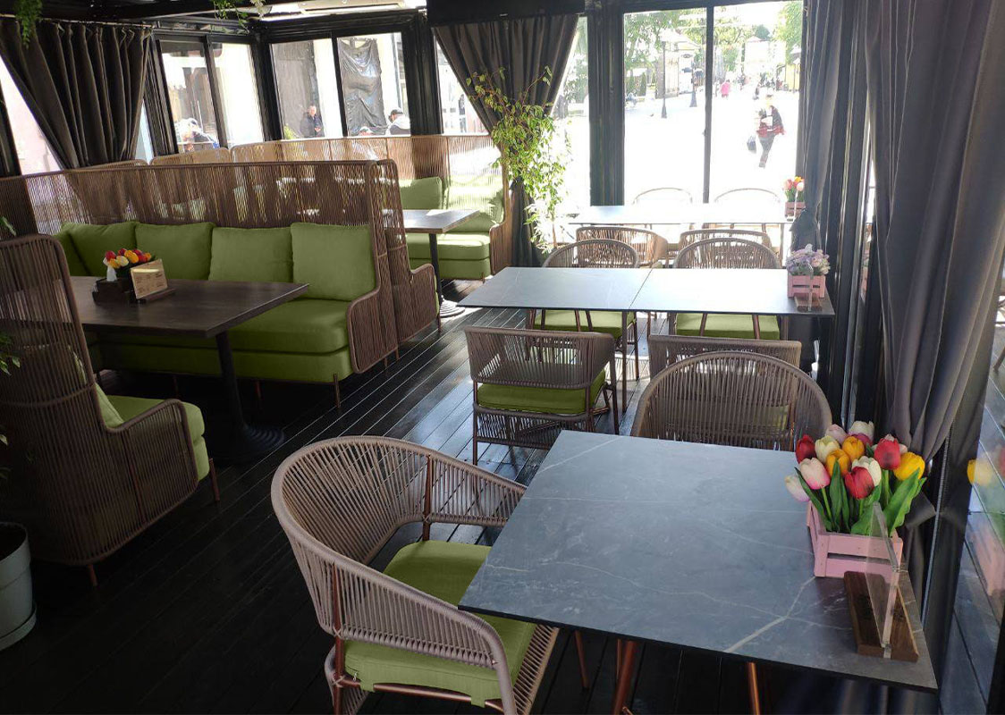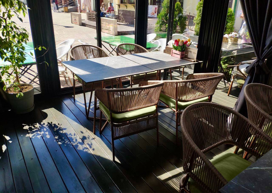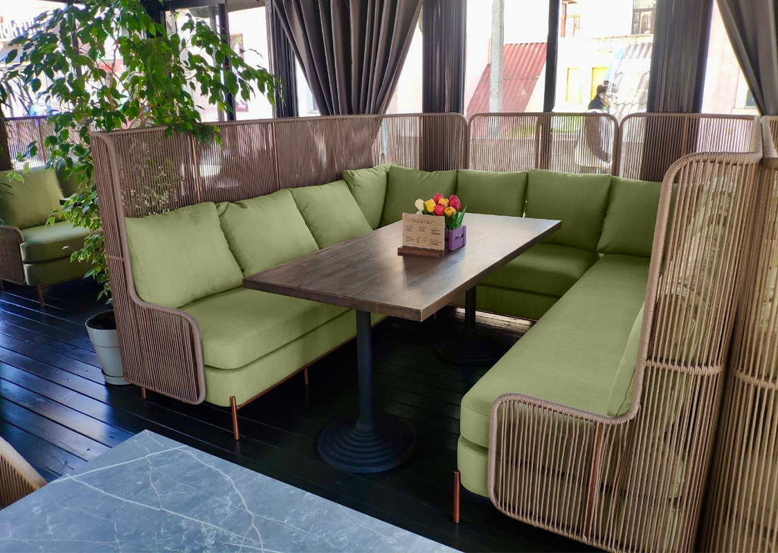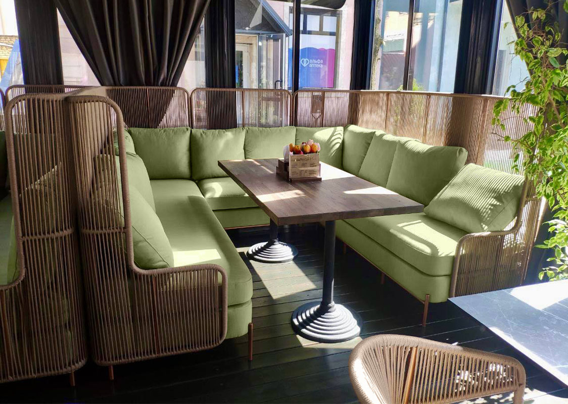 Комплект садовой мебели на террасу и веранду ROFF Alto, плетенный из синтетического шнура, включает в себя П-образные диваны с высокой спинкой коллекции Roff, состоящие из 3-х модулей (2 боковых, шхгхв - 240х75х100 см и центральный, шхгхв - 100х75х100 см); обеденные стулья, шхгхв - 56х72х80 см и обеденный стол на металлокаркасе, шхгхв - 80х80х75 см. Материал каркаса - металл с полимерным покрытием. Мягкие элементы входят в комплект и изготовлены из экологичной и водоотталкивающей ткани. К заказу принимаем любую комплектацию и размер. Возможно изменить цвет ткани, текстуру и материал плетения.