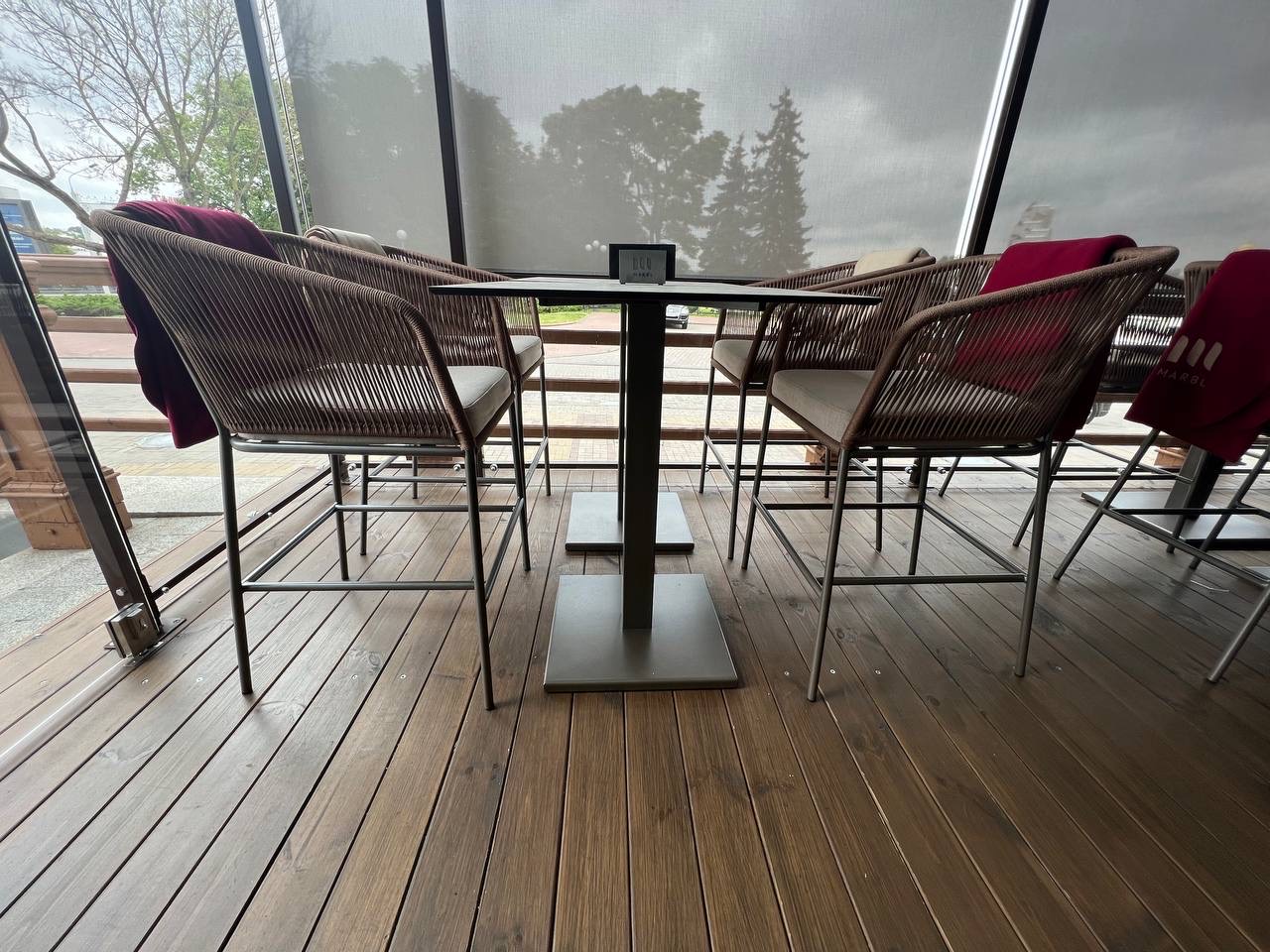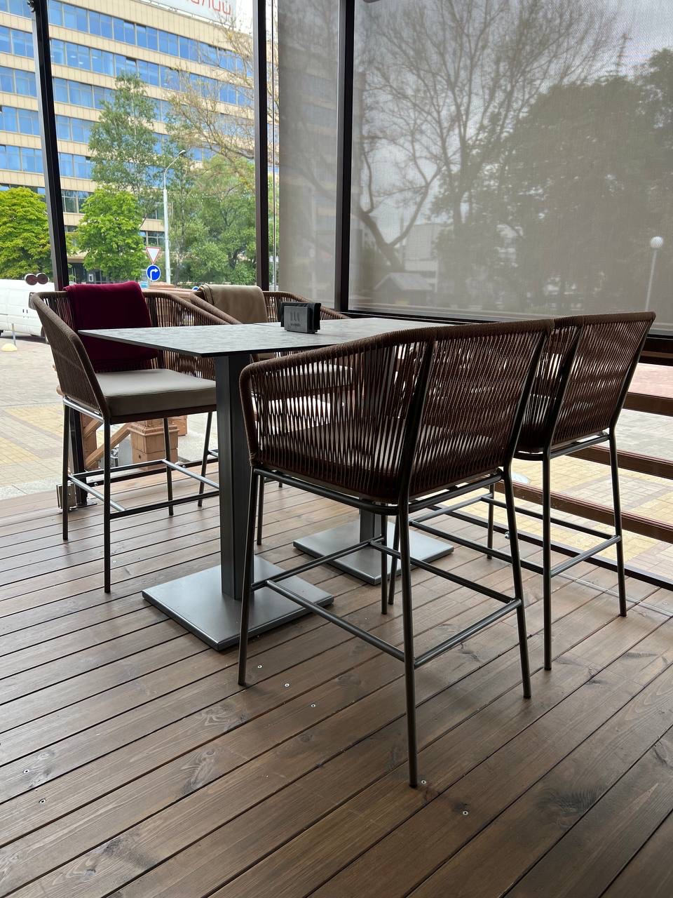 Комплект уличной мебели IRIS - это стильное решение для террасы дома, кафе, бара или ресторана. В комплекте: полубарный стул IRIS 56х55х102 см и полубарный квадратный металлический стол ORLANDO 60х60х100 см, мягкие элементы. Материал плетения - синтетический шнур. К заказу принимаем любую комплектацию и размер. Возможно изменить цвет, текстуру и материал плетения.