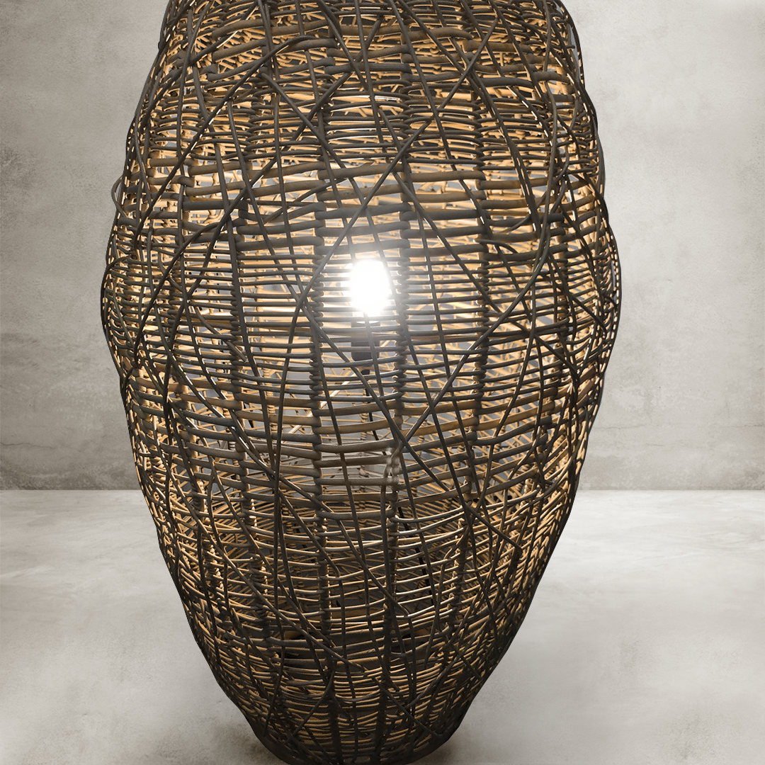 Декоративный напольный плетеный абажур PIN изготовлен из искусственного ротанга на металлическом каркасе. Габаритные размеры, шхгхв, см: 56х56х200. Такой абажур несомненно станет украшением  любой террасы или веранды, а так же кафе, бара или ресторана.
