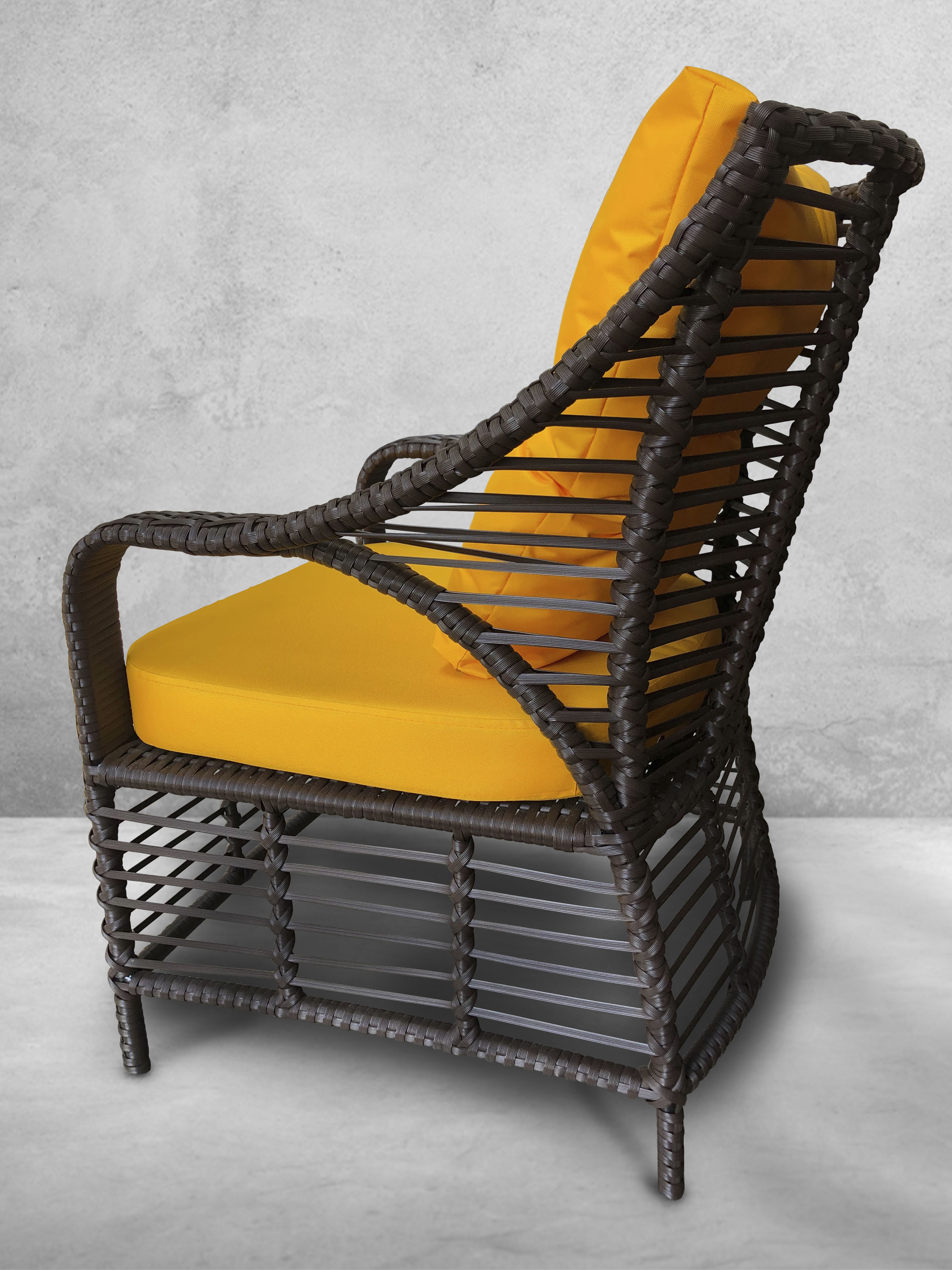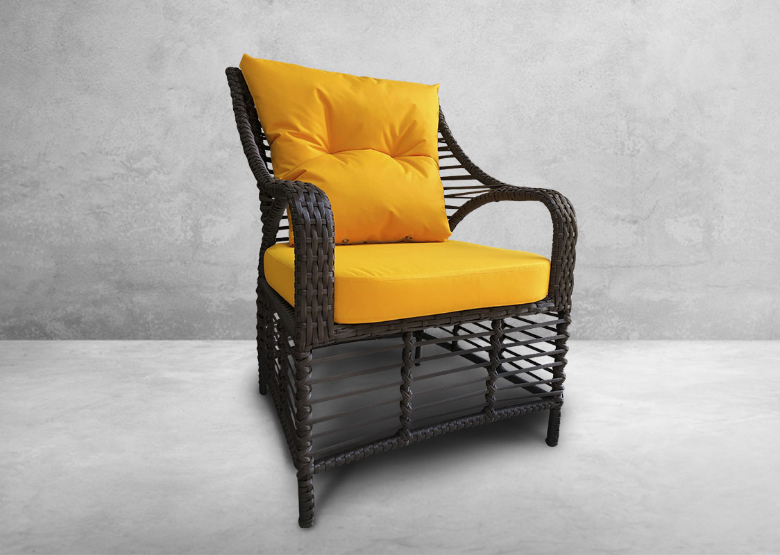 Садовое кресло BEI Brown в цвете "шоколад", с подлокотниками из искусственного ротанга, на металлическом каркасе, идеально дополнит любую обеденную группу на террасе дома, ресторана или кафе, в лаунж зоне. Мягкие элементы входят в комплект. По желанию заказчика, размер, цвет и материал плетения можно изменить.