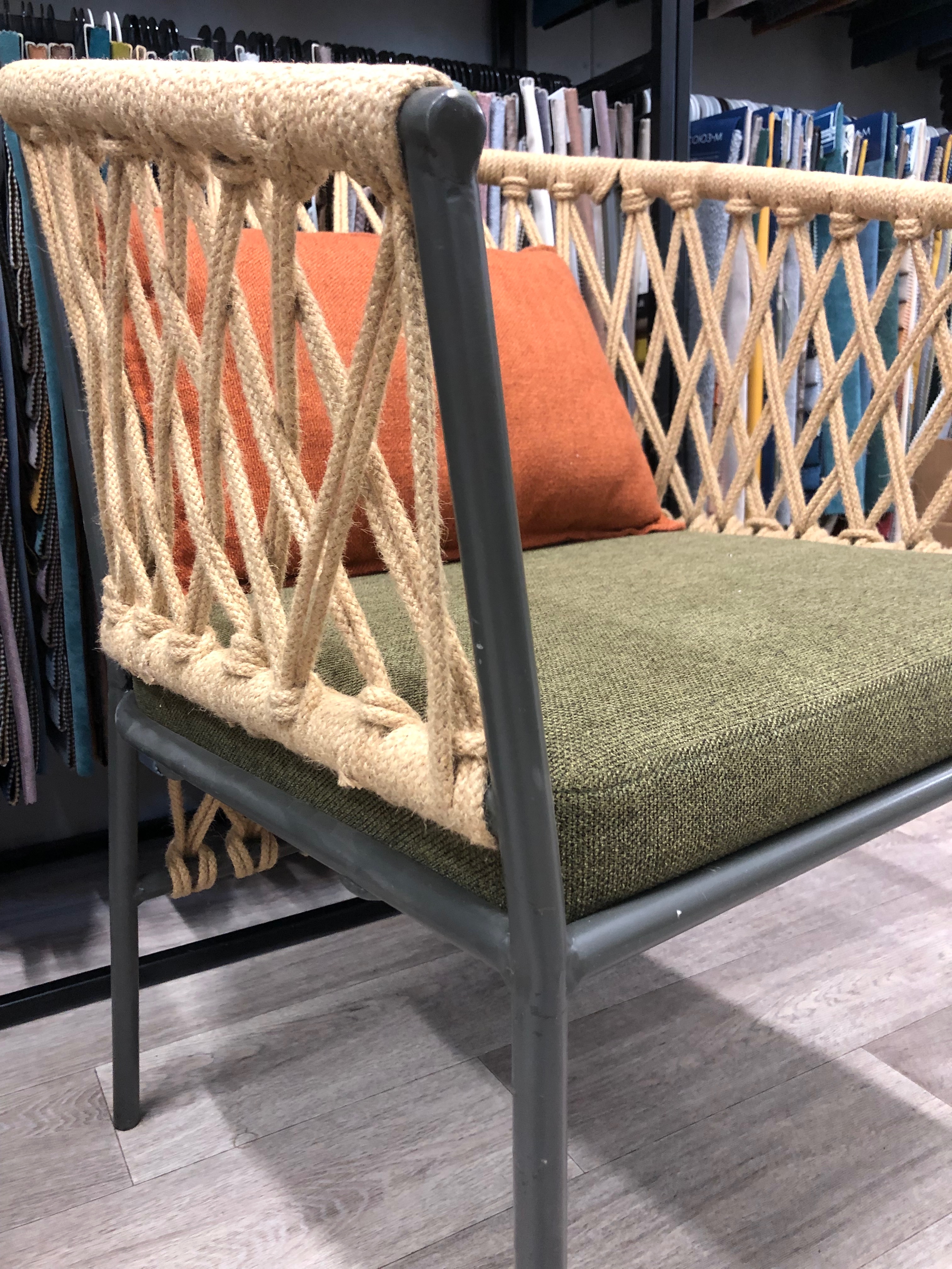 Садовое плетеное кресло DJUT из синтетического шнура на металлическом каркасе. Идеально дополнит любую обеденную группу на террасе дома, ресторана или кафе, лаунж зоне. Мягкие элементы входят в комплект. По желанию заказчика, размер, цвет и материал плетения можно изменить.