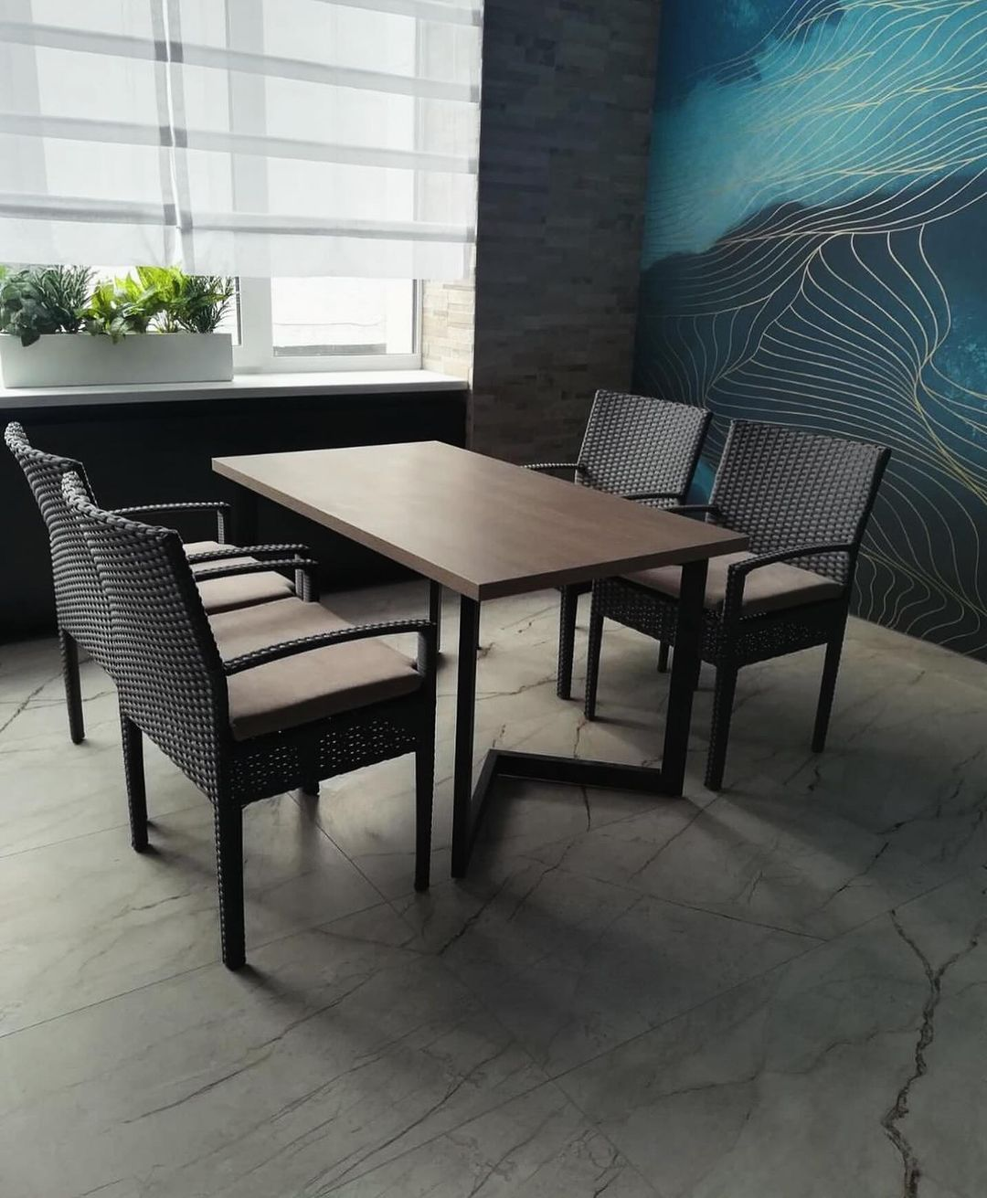 Садовое плетеное кресло MODERN с подлокотниками из искусственного ротанга на металлическом каркасе. Идеально дополнит любую обеденную группу на террасе дома, ресторана или кафе, лаунж зоне. Мягкие элементы входят в комплект.