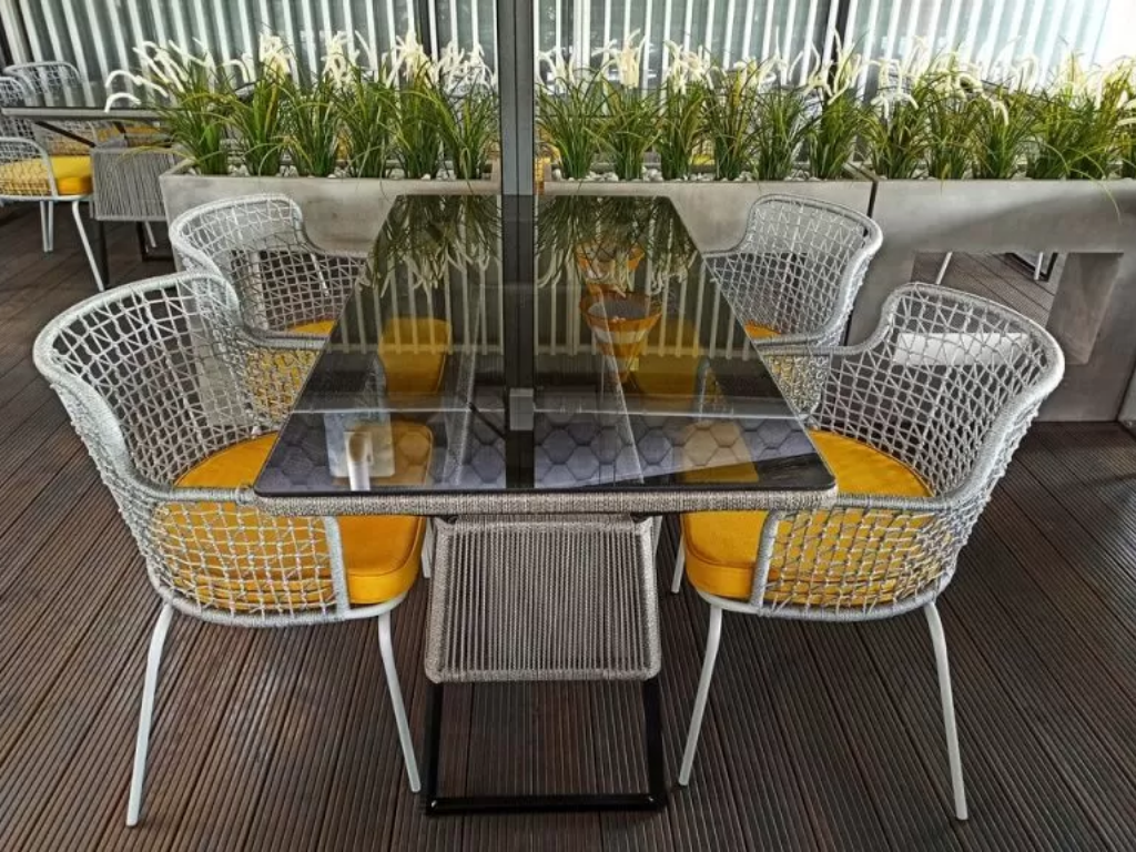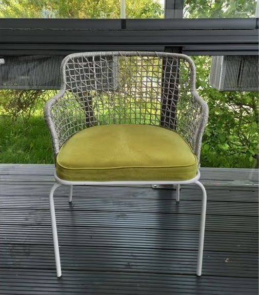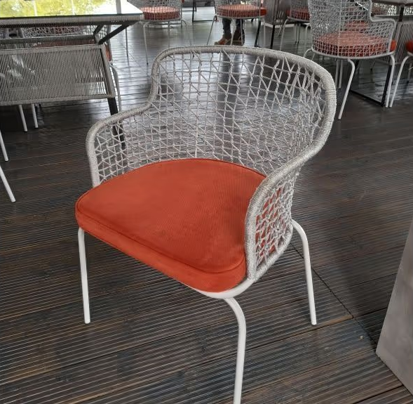 Садовый плетеный стул CLOUD из синтетического шнура, толщиной 6 мм, на металлическом каркасе, идеально дополнит любую обеденную группу. Высота посадки - 45 см. Мягкие элементы входят в комплект. По желанию заказчика, размер, цвет и материал плетения можно изменить.
