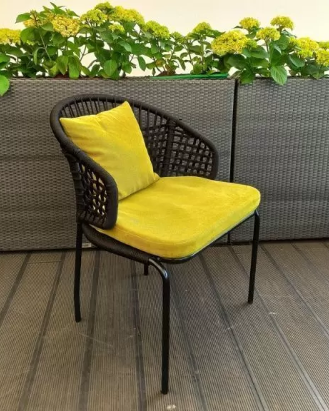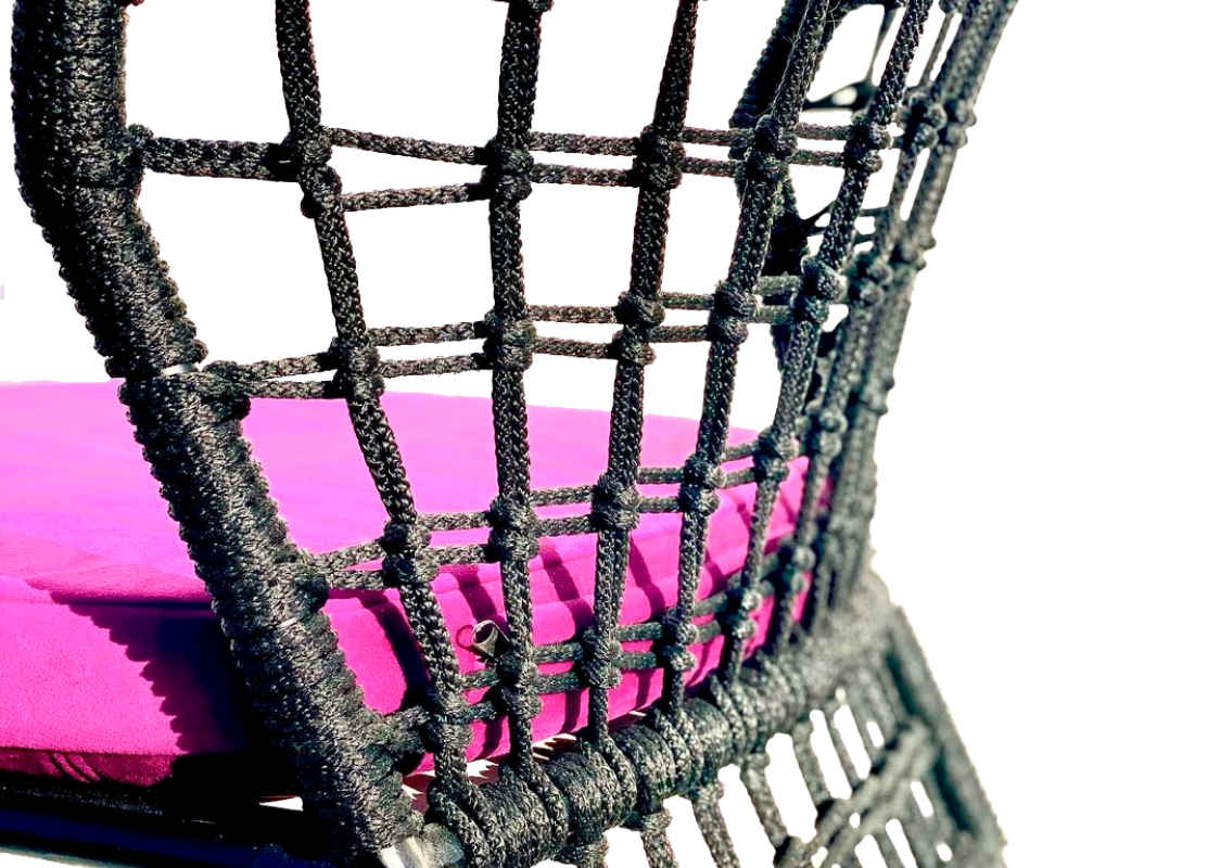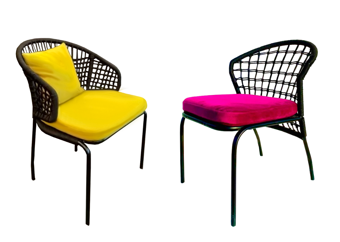 Садовый плетеный стул EMBER из синтетического шнура, толщиной 6 мм, на металлическом каркасе, идеально дополнит любую обеденную группу. Высота посадки - 46 см. Мягкие элементы входят в комплект. По желанию заказчика, размер, цвет и материал плетения можно изменить.