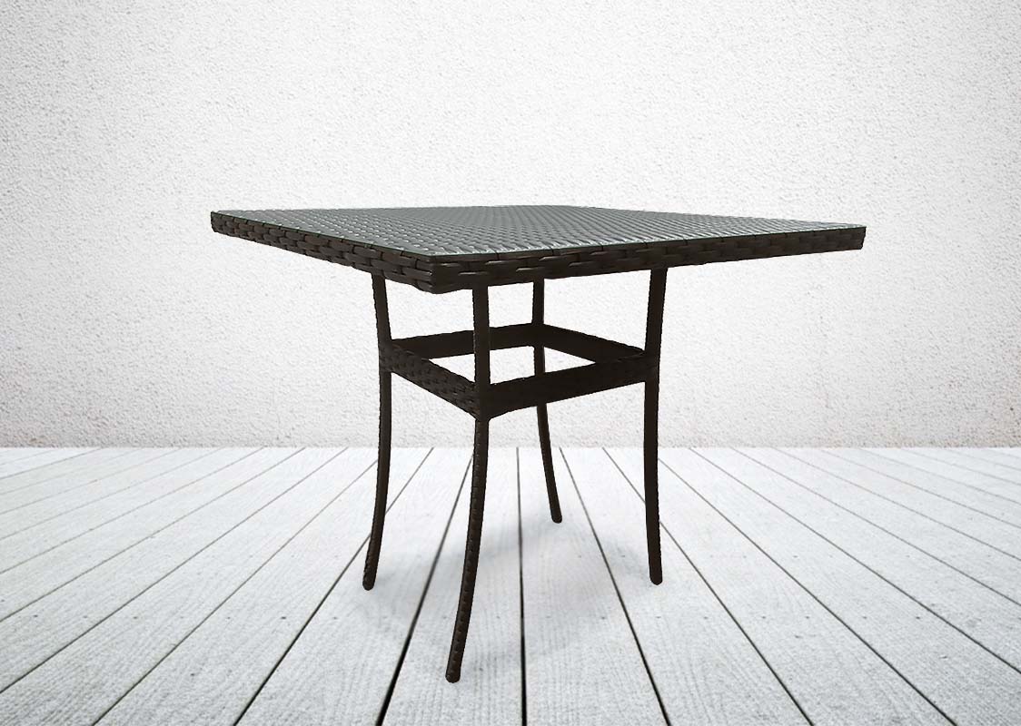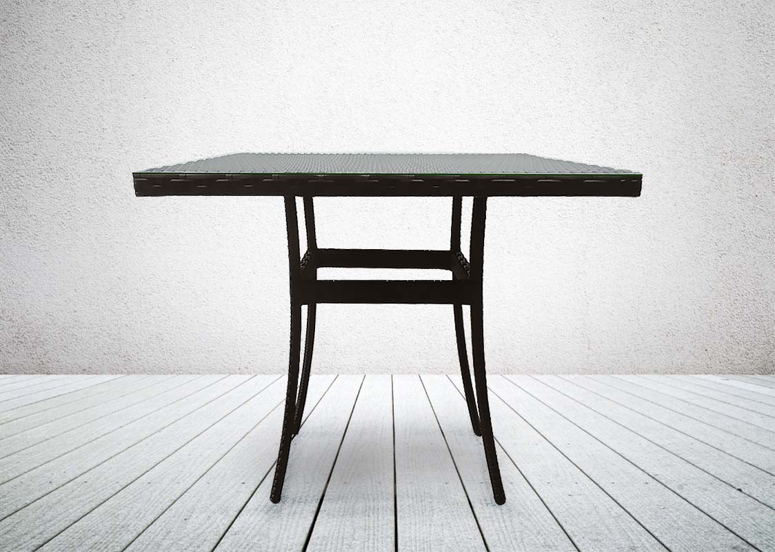 Обеденный садовый стол плетеный из искусственного ротанга на металлическом подстолье со стеклянной столешницей. Материал плетения - искусственный ротанг или синтетический шнур (на выбор). Подстолье изготовлено из профильной трубы 20 мм толщиной стенки 1.2 мм, с нанесенным на него защитным полимерным покрытием. В основании ножек подстолья предусмотрены пластиковые подпятники для защиты пола от царапин.