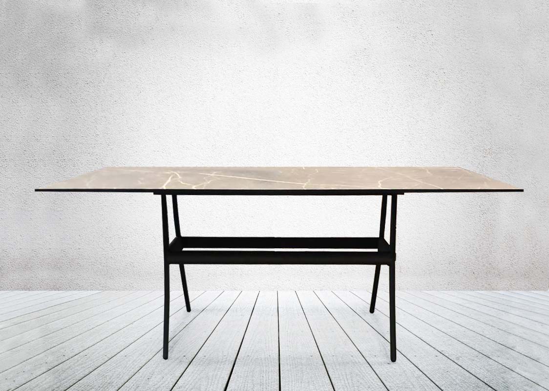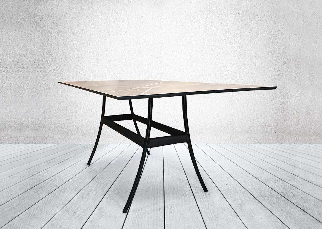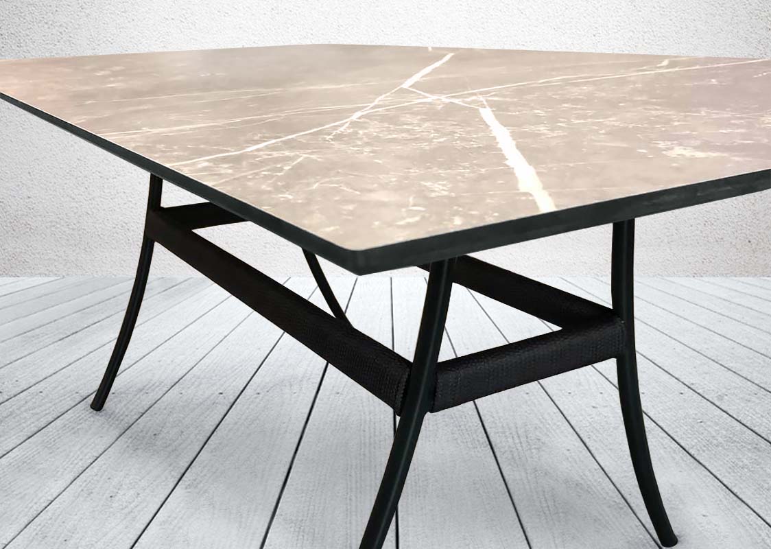 Садовый плетеный кофейный столик коллекции EMBER на металлическом подстолье со столешницей HPL. Материал плетения - искусственный ротанг или синтетический шнур (на выбор).