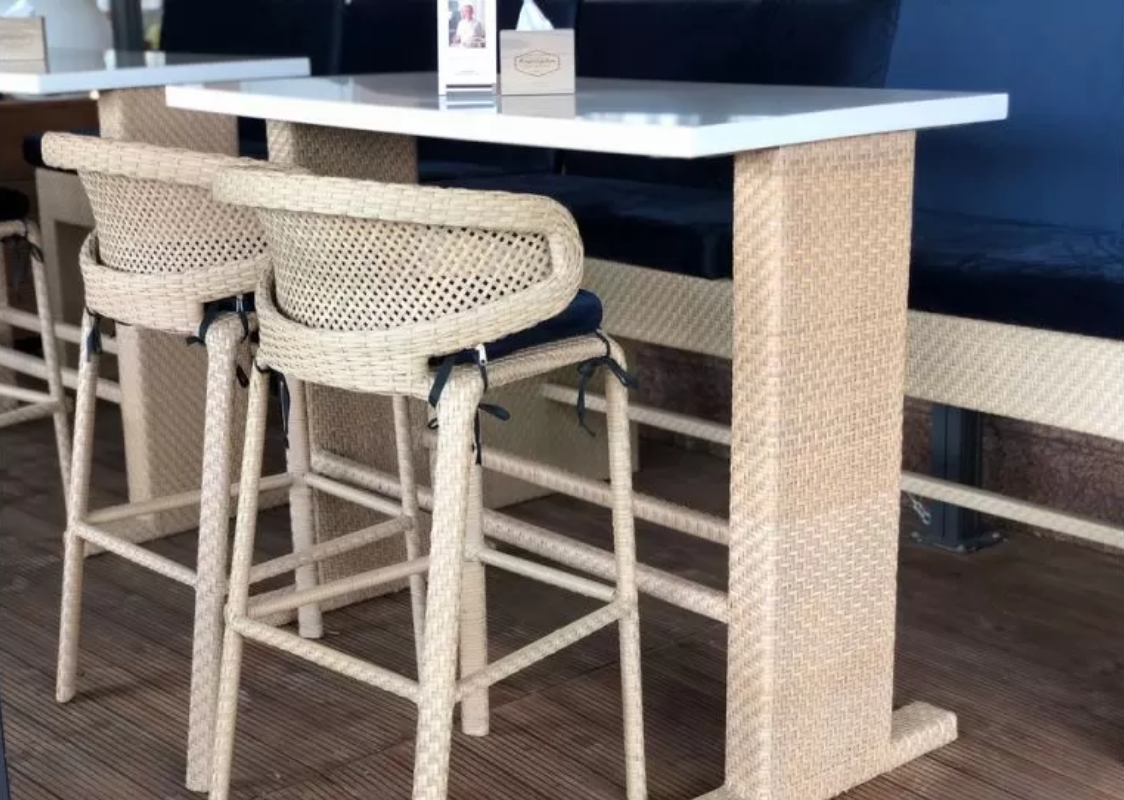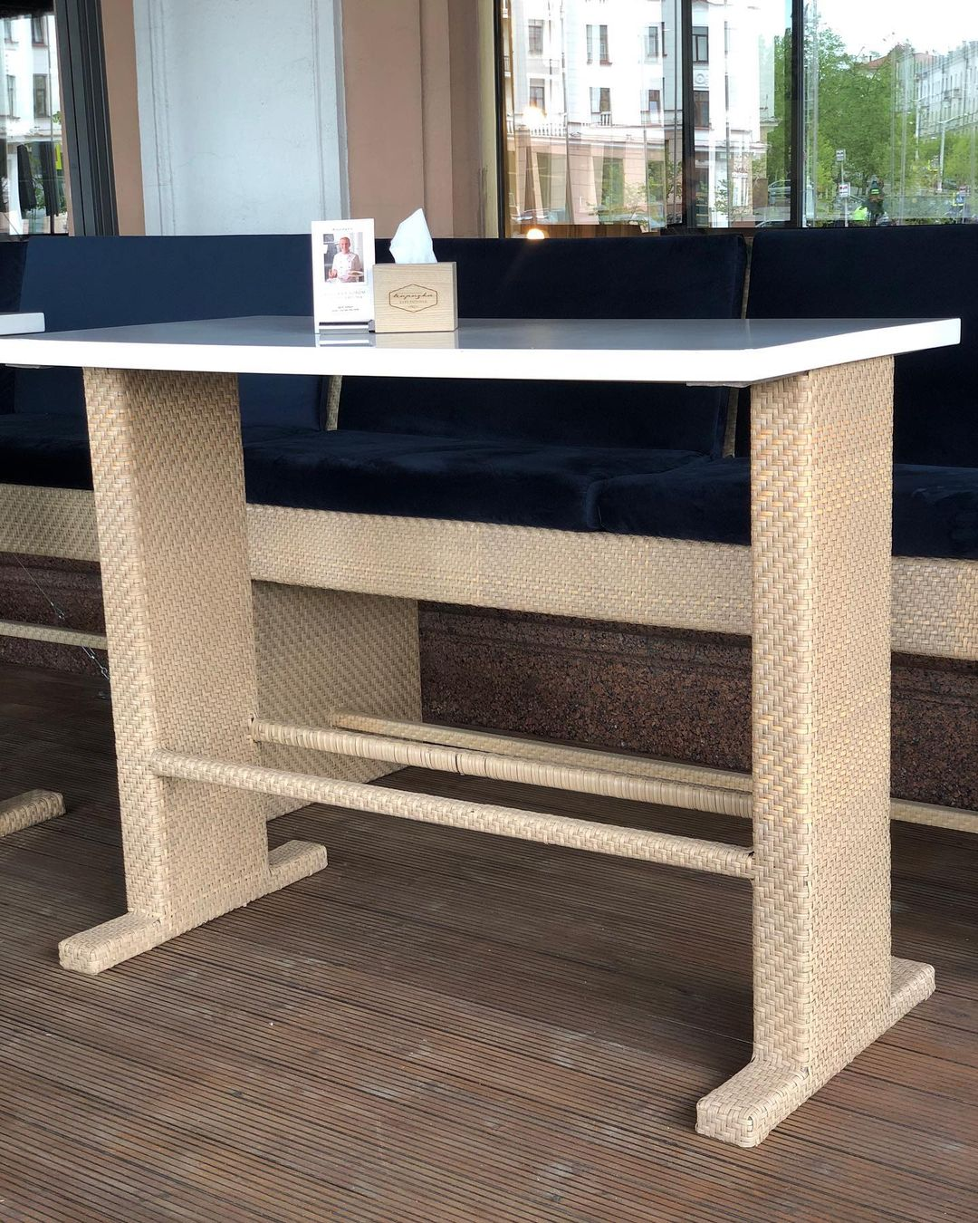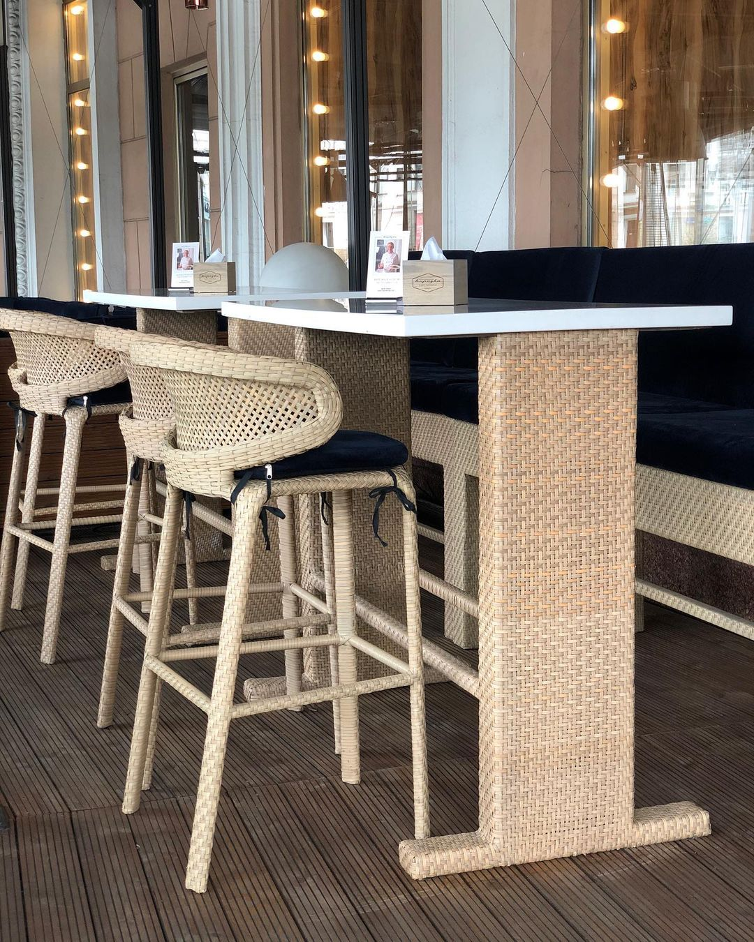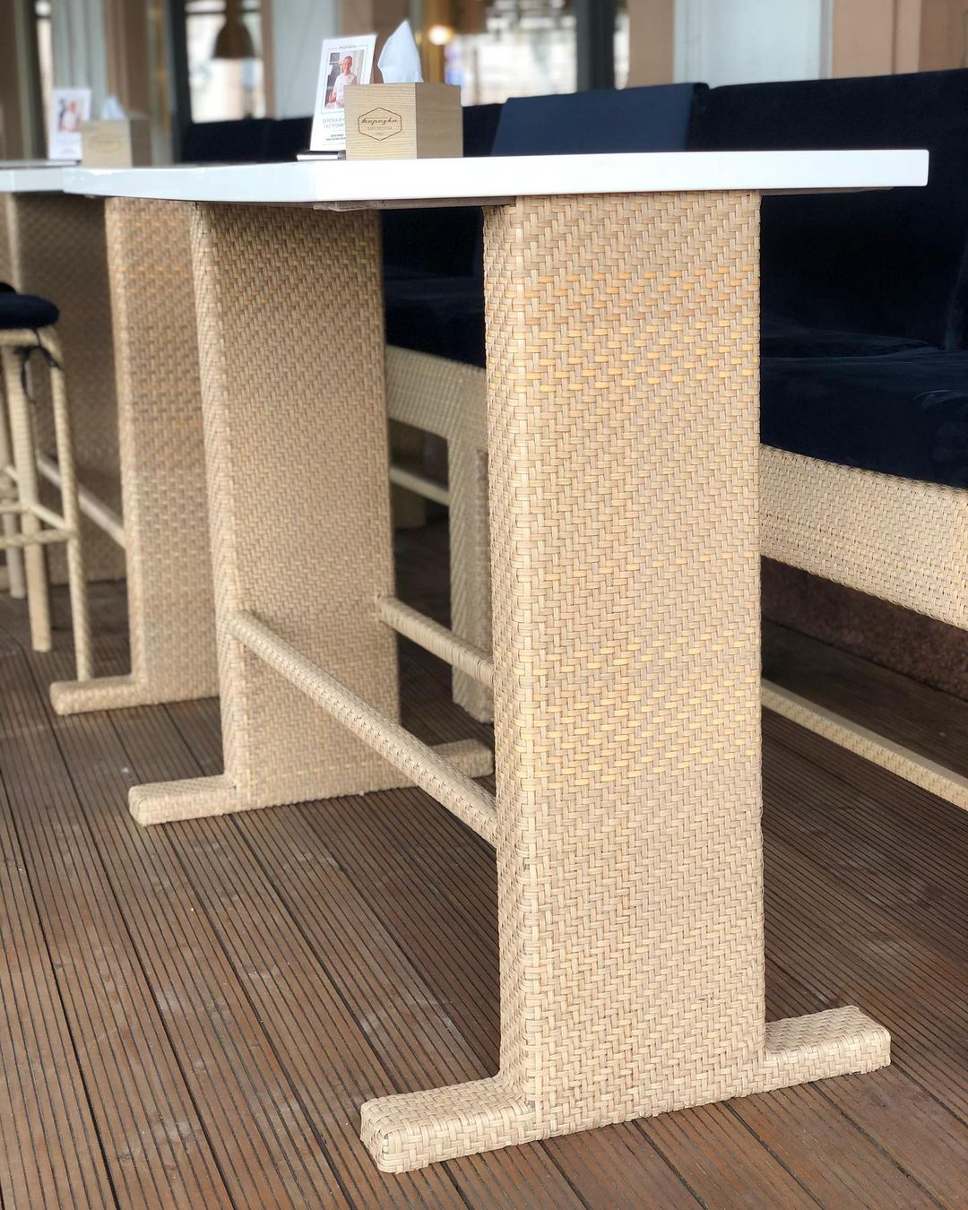 Уличный барный/полубарный стол MARI из искусственного ротанга на металлическом каркасе с каменной столешницей - лучшее решение для террасы ресторана, кафе или бара. По желанию заказчика, размер изделия, цвет и материал плетения могут быть изменены.