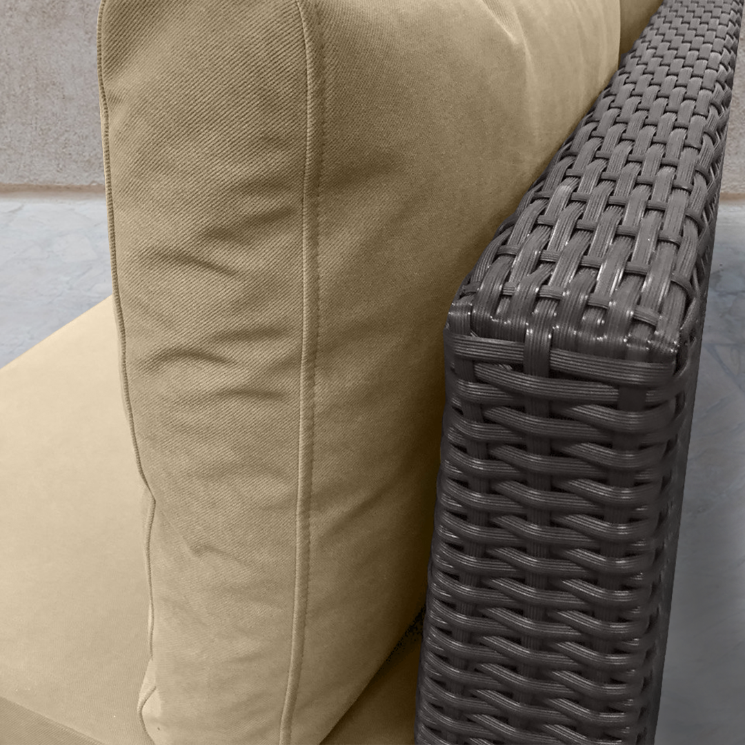 Материал мягких элементов - велюр. Внутреннее наполнение мягких элементов изготовлено из нескольких слоев поролона различной степени плотности и мягкости. Плетение из искусственного ротанга способно выдерживать большую весовую нагрузку, не подвержено выгоранию или потрескиванию под воздействием ультрафиолетового излучения и великолепно переносит любые погодные условия и перепады температур воздуха. Надёжный каркас выдерживает большие нагрузки.